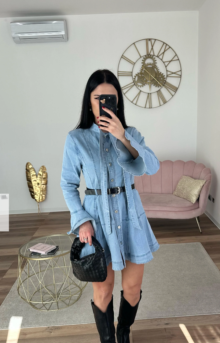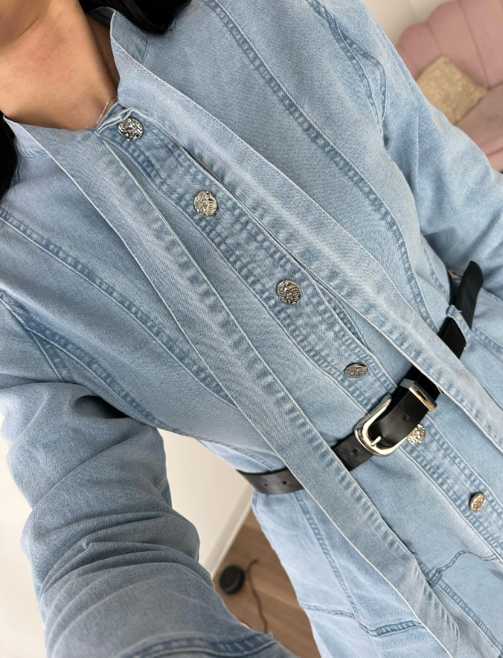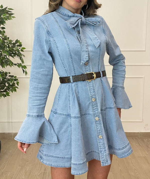 Abito in denim modello sfasato, con tasche e bottoncini regolabili sul davanti, maniche ampie sul fondo, completo di cinturino.