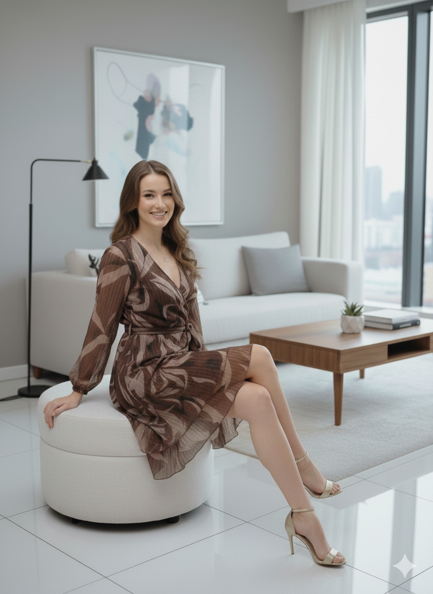Elegante abito a portafoglio con scollo a V incrociato e maniche lunghe trasparenti. Il design con gonnellina a balze dona un movimento leggero e femminile.