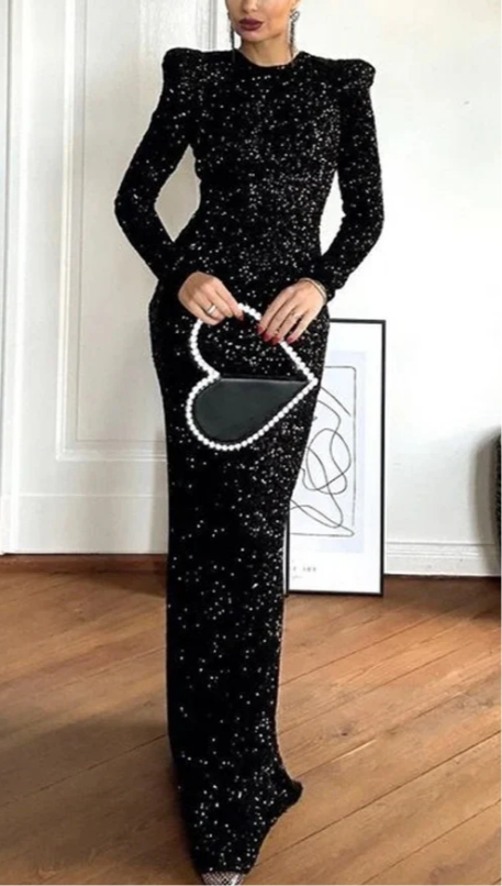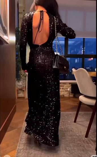 Abito Lungo Elegante Interamente in Paillettes Vestito Schiena Scoperta.
