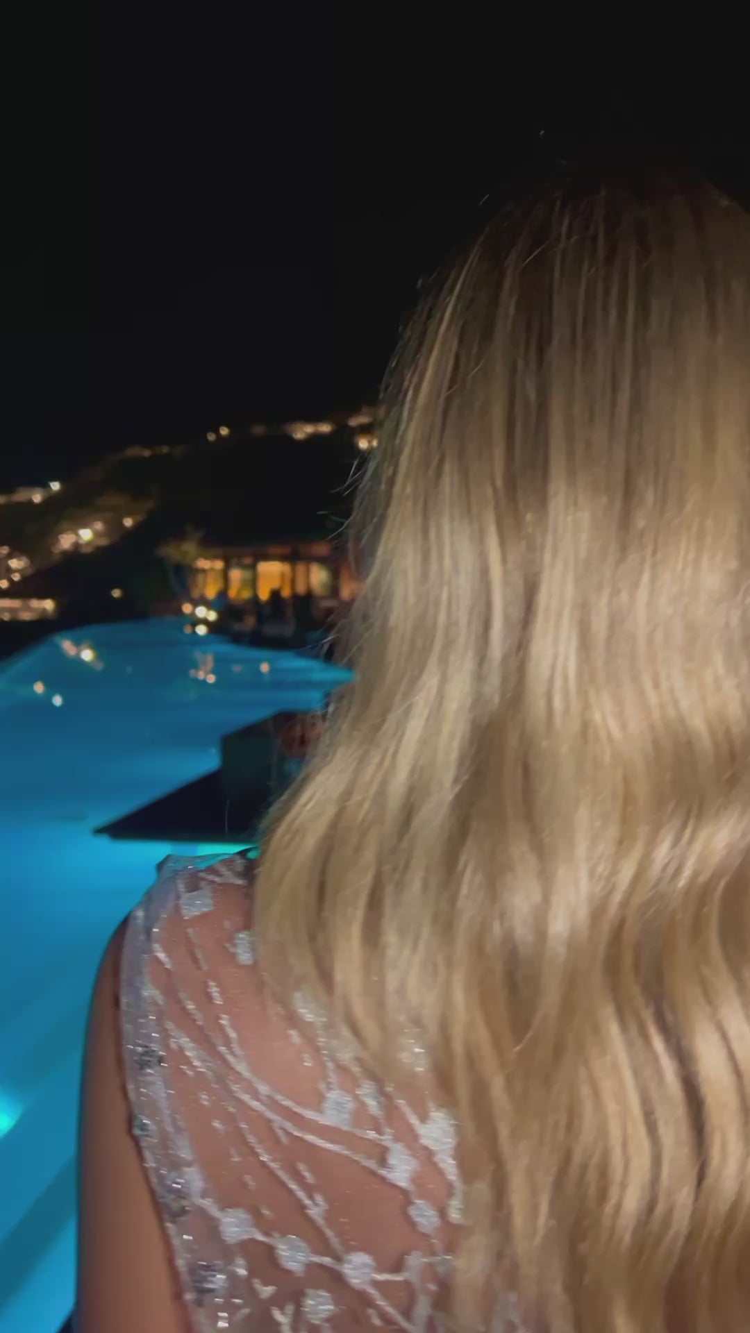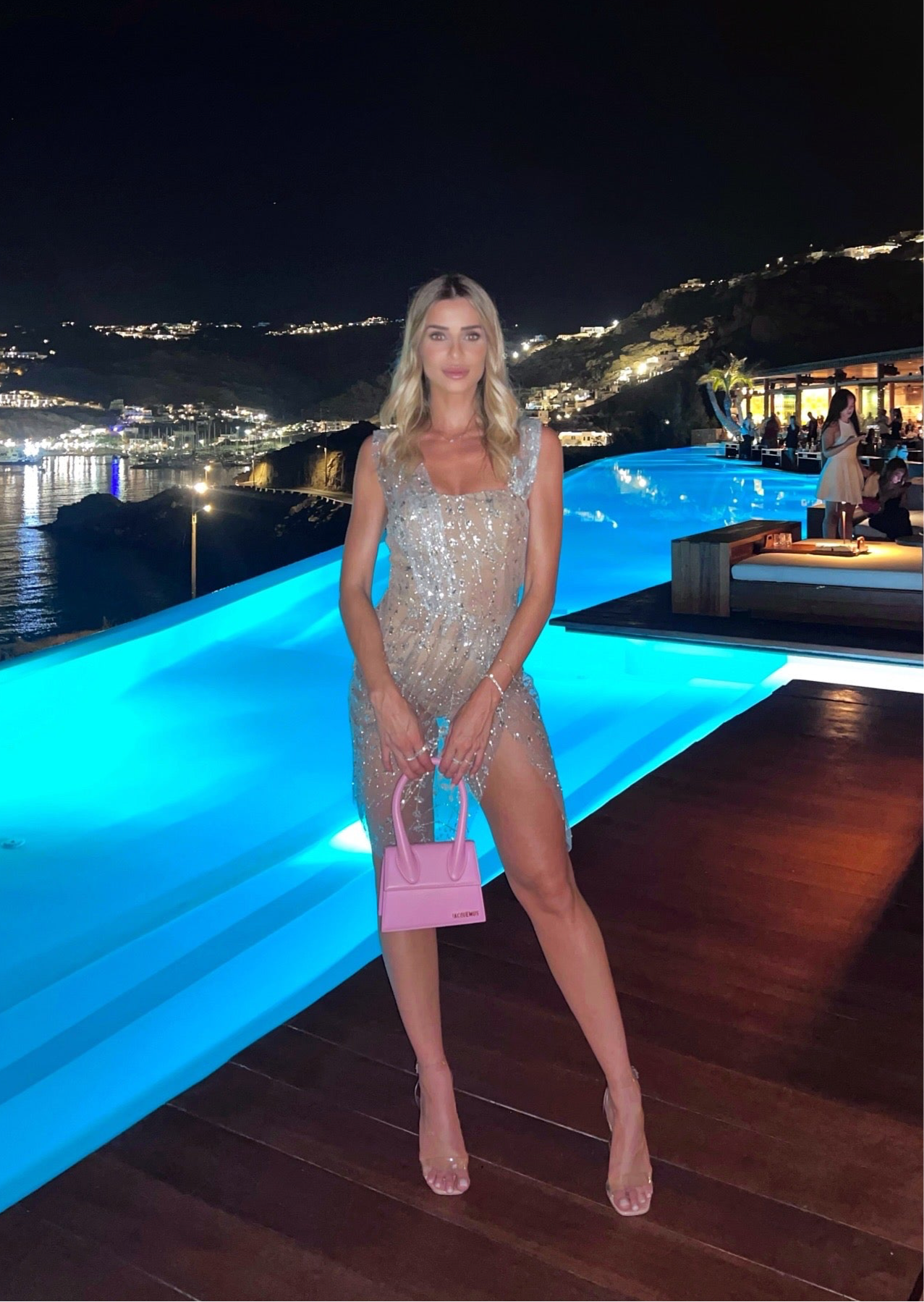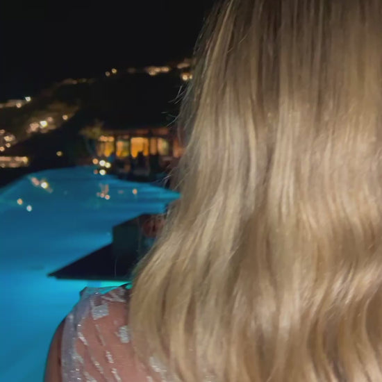 Mini abito raffinato ed elegante composto da un body color carne e cascata di velo trasparente con paillettes argento incastonate.