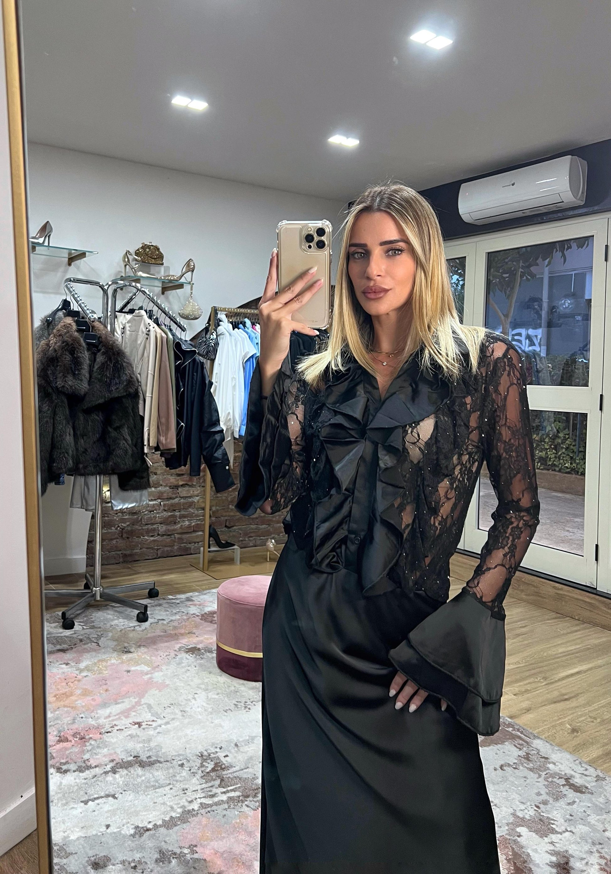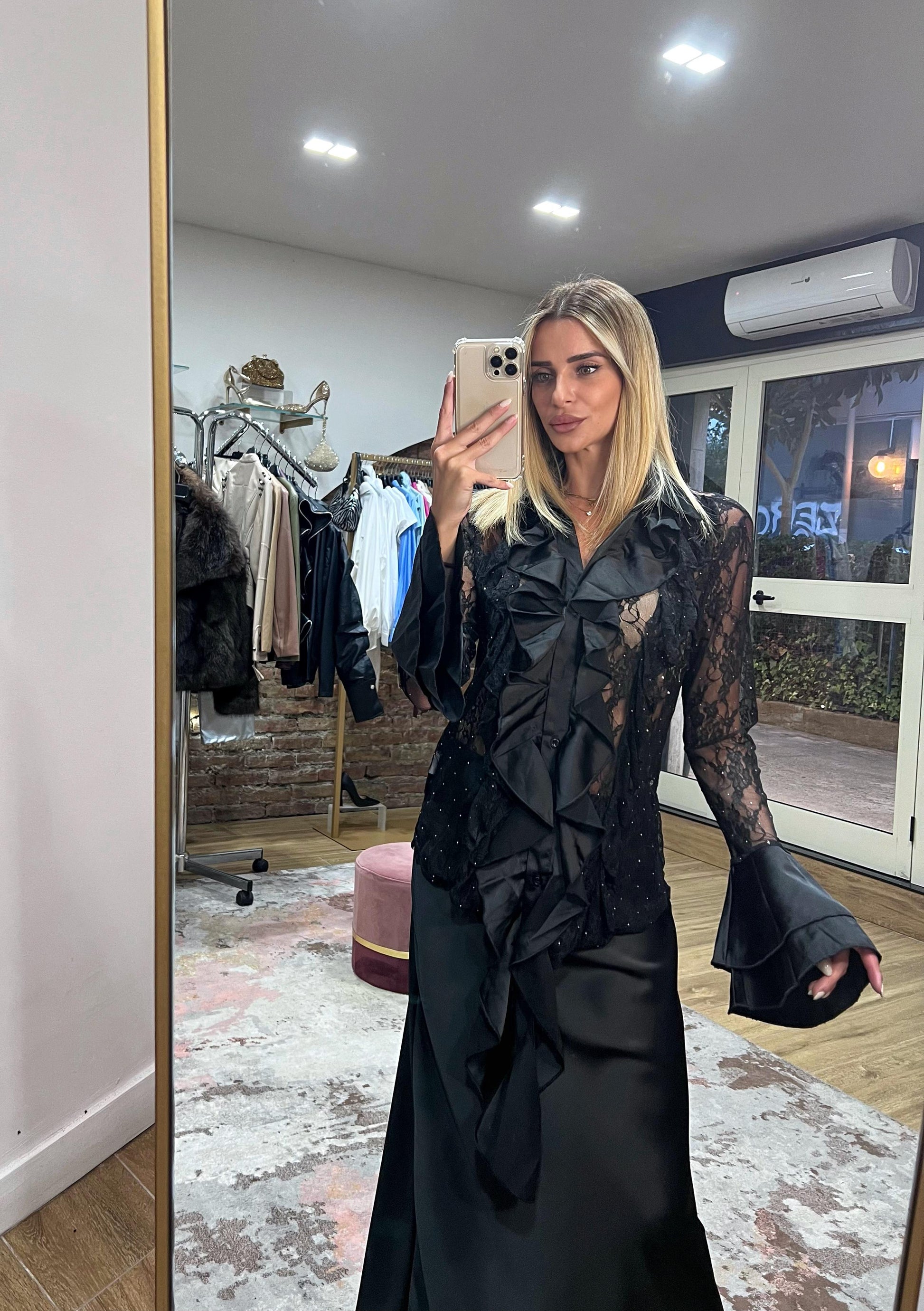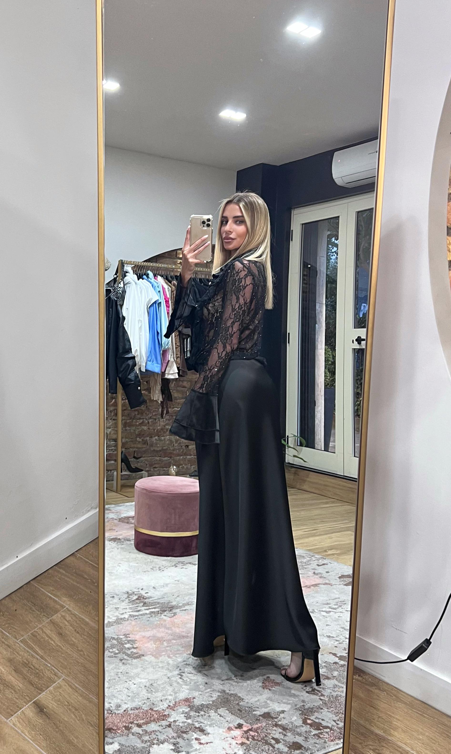 Camicia nera semitrasparente, in pizzo , con piccoli punti luce.