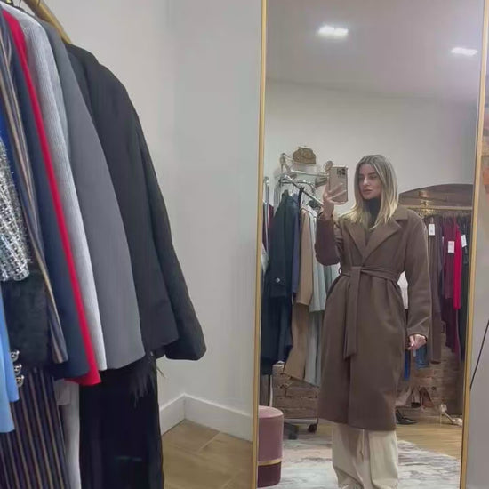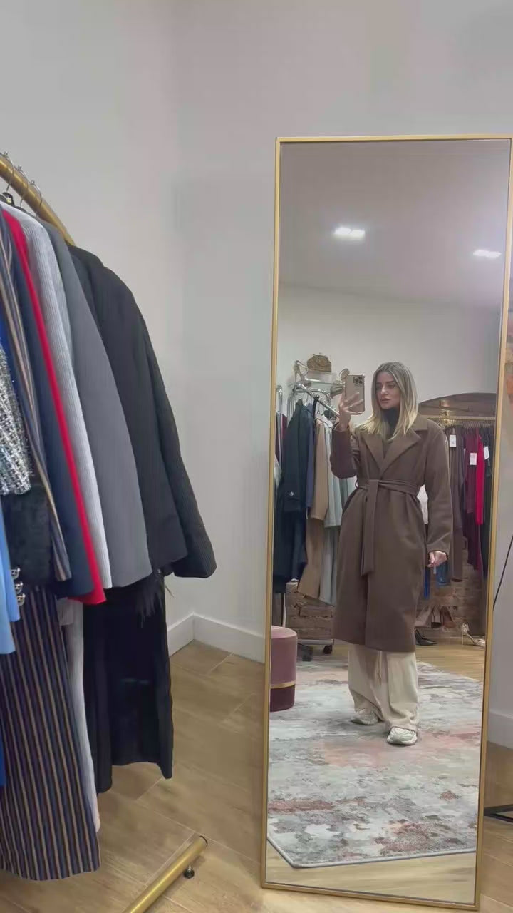 Cappotto in morbido panno colore tabacco, chiusura frontale con bottone