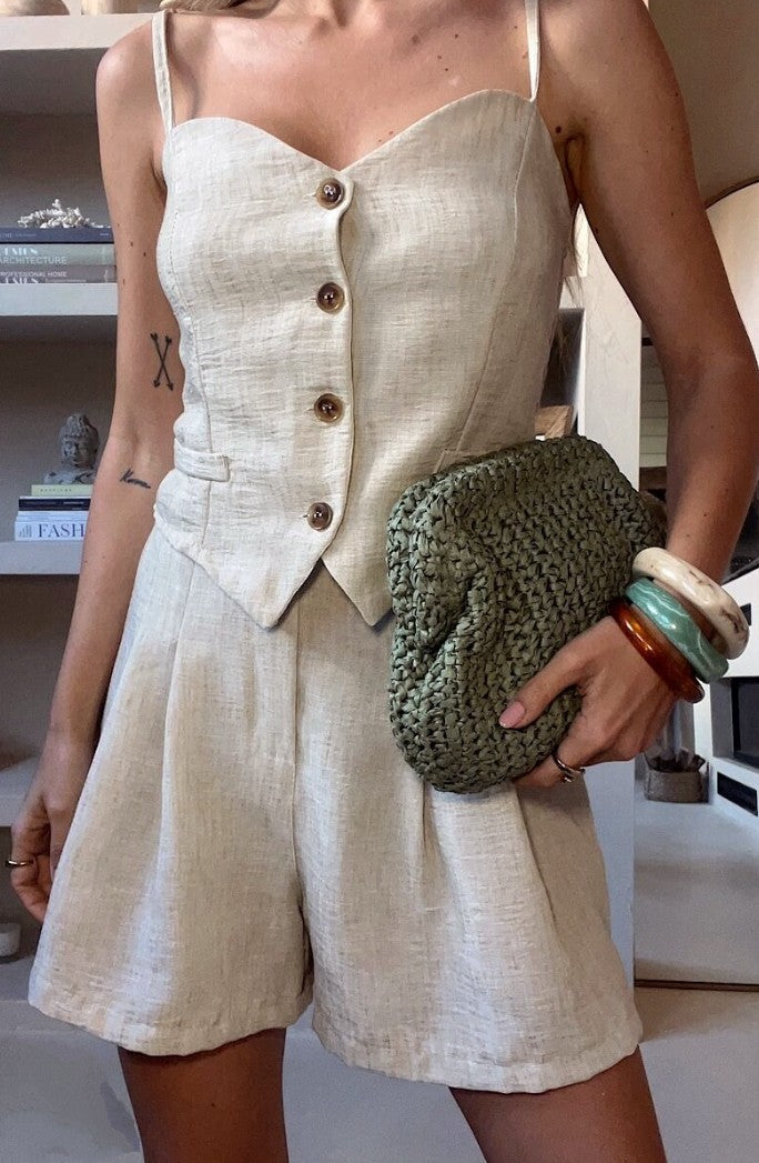 Grazioso completo. Composto da pantaloncini con elastico in vita e un top con bottoni sul davanti. Super comodo , colore beige. Il tessuto è simile al lino ma non trasparente.