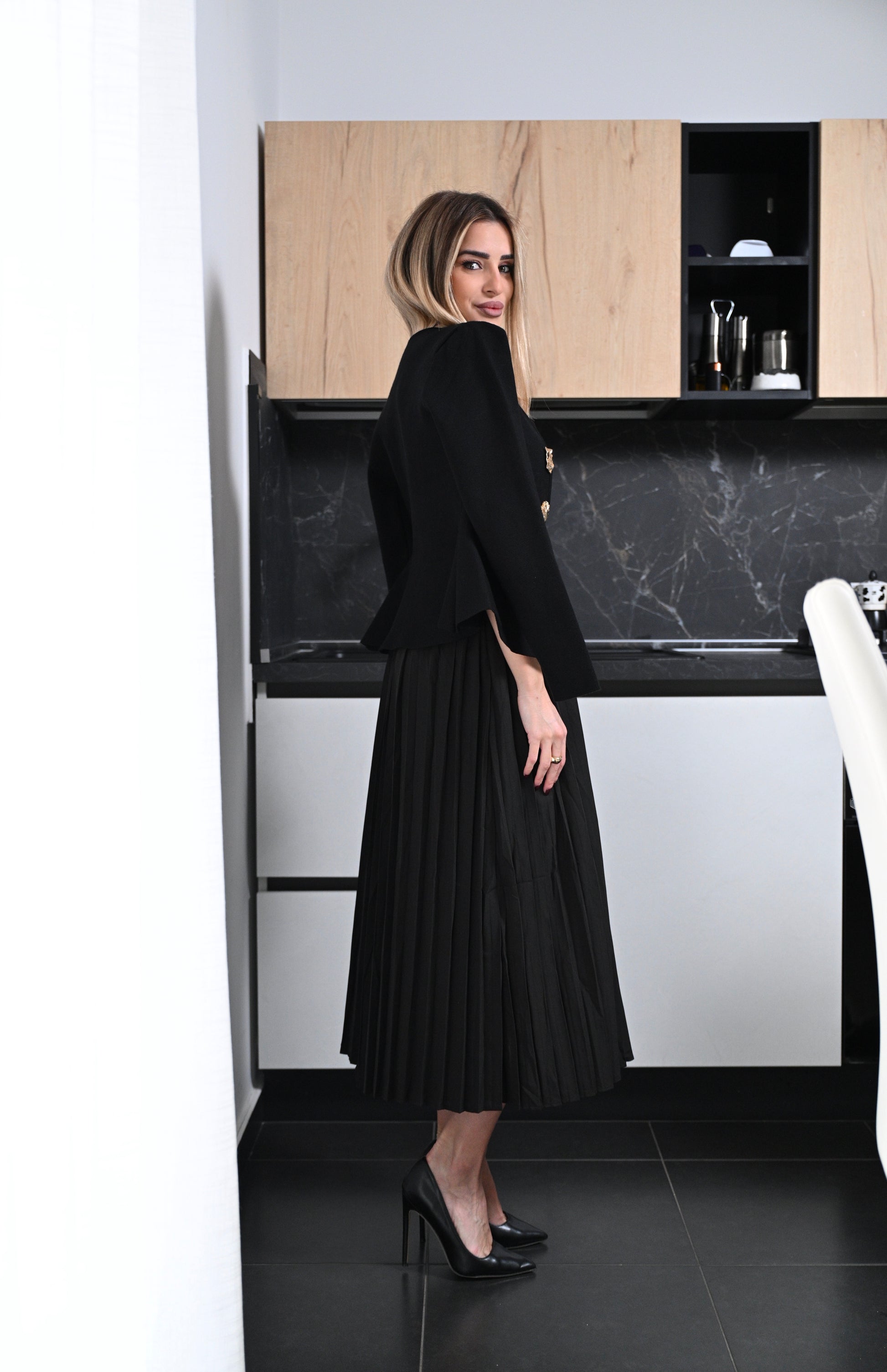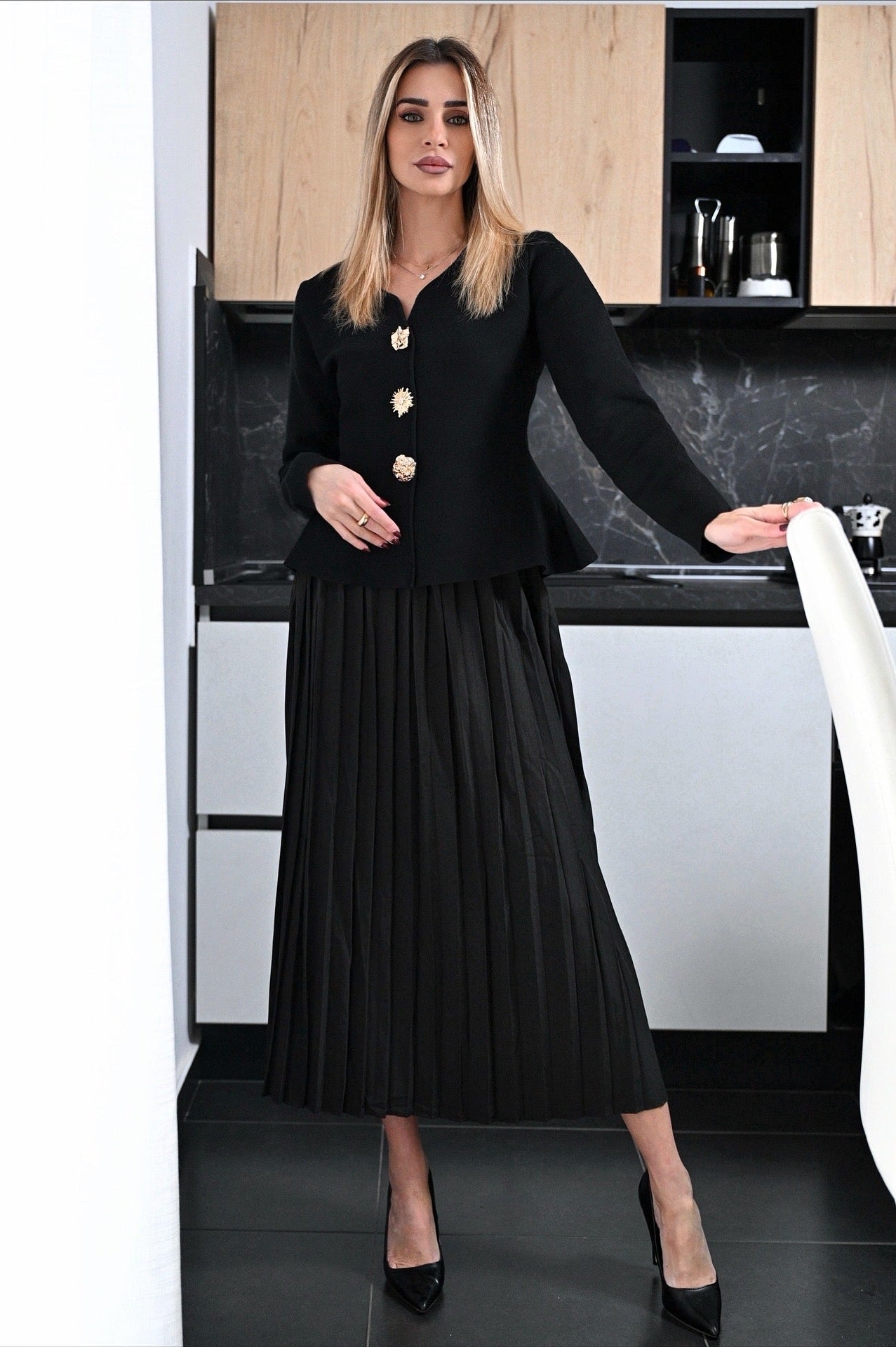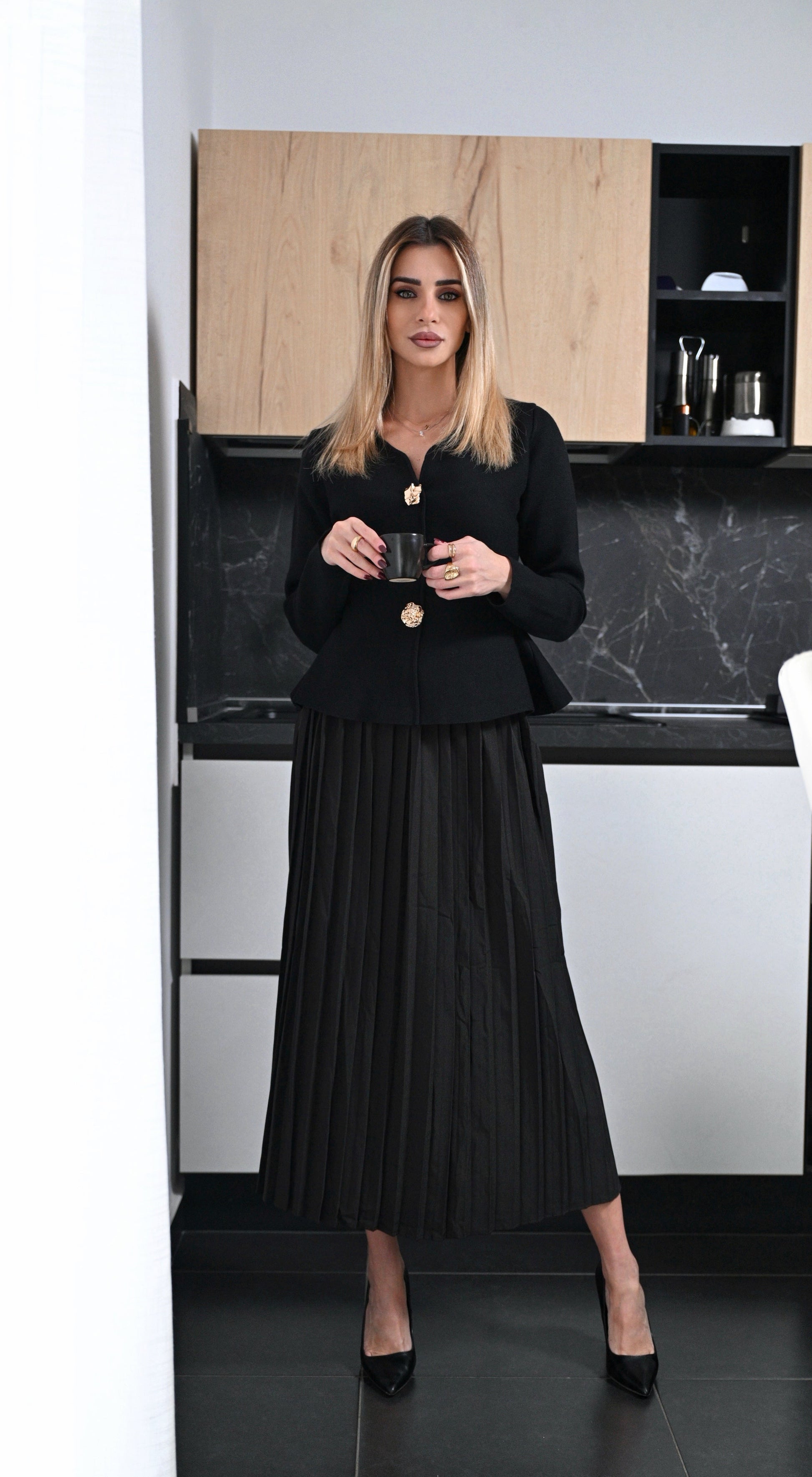 Un sofisticato completo due pezzi in tinta unita colore nero, perfetto per un look elegante e versatile.