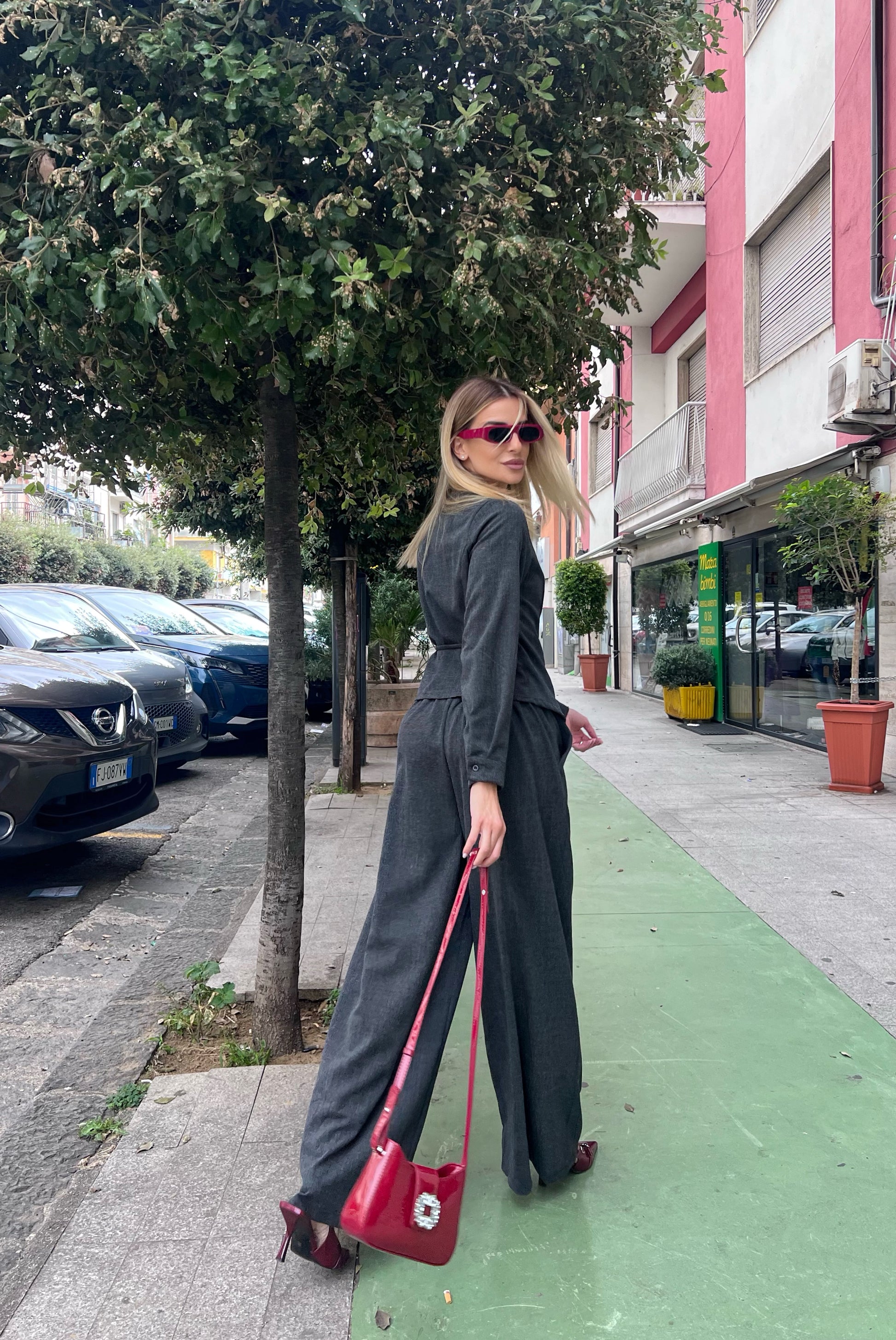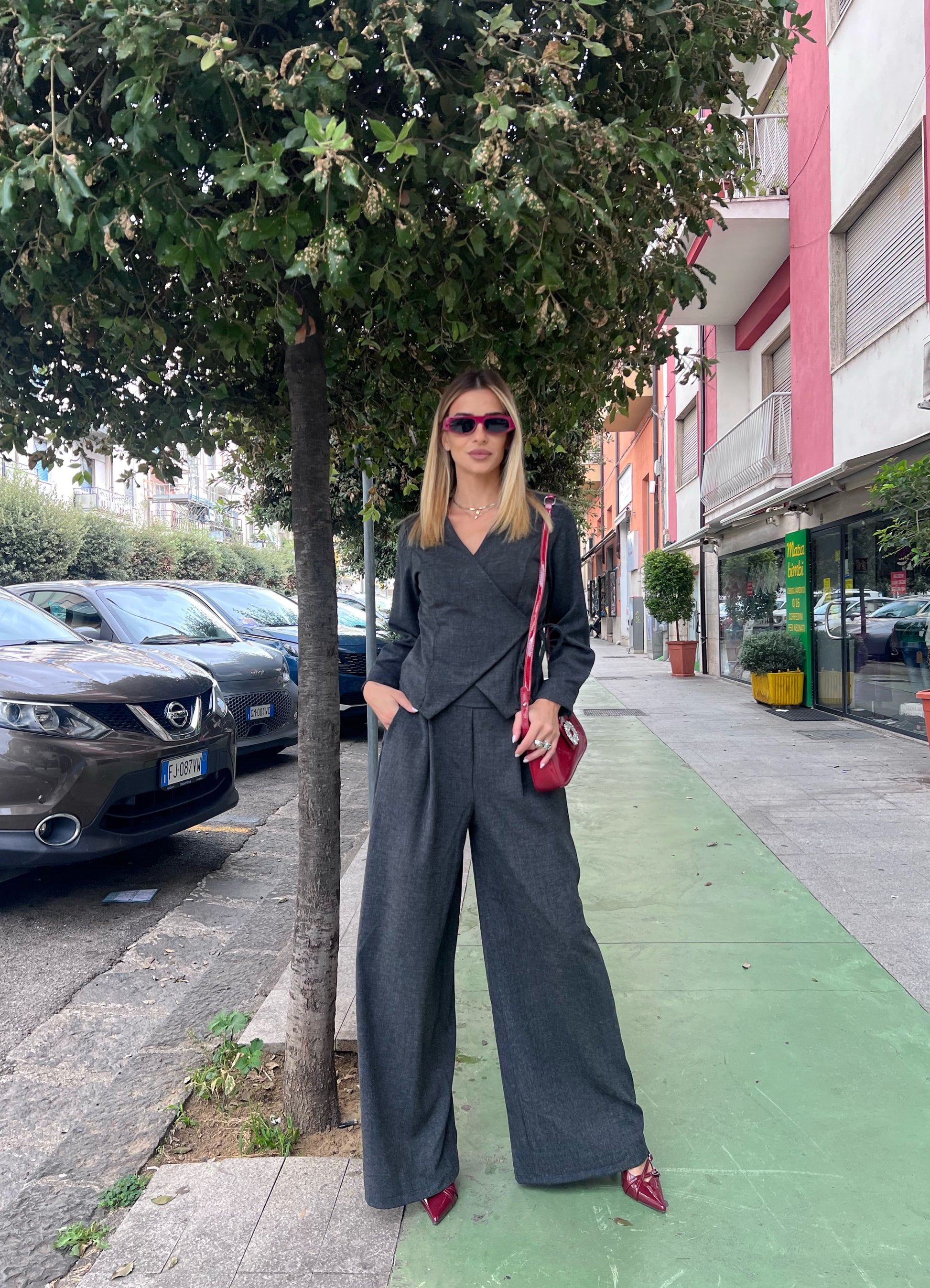 I pantaloni sono a palazzo, hanno un'elastico nella parte posteriore del girovita e una cerniera sul davanti, oltre a delle pence che creano volume e drappeggio. Il completo è a taglia unica.