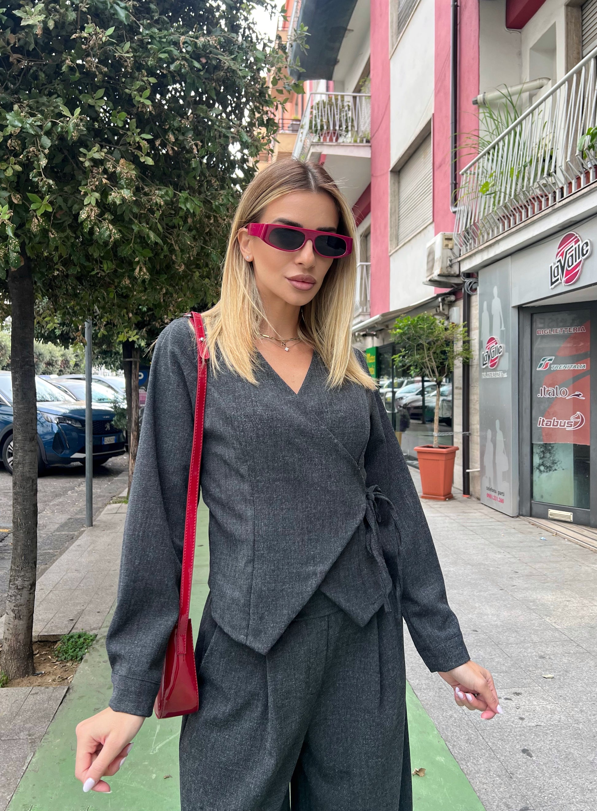 La giacca ha un design a portafoglio con un laccetto che si lega in vita per chiuderla.