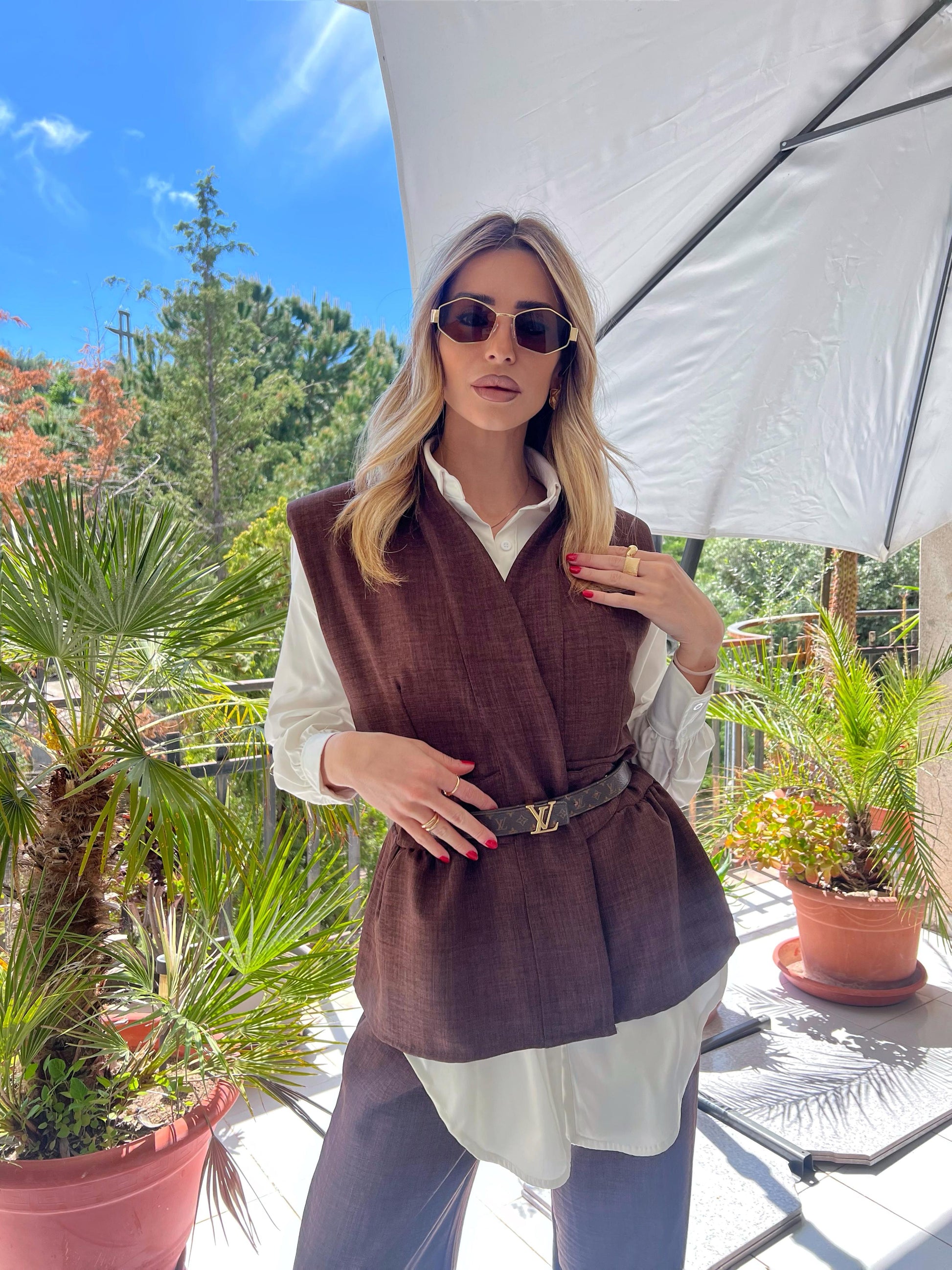 Gilet doppiopetto con spalline incorporate e chiusura con bottoni .