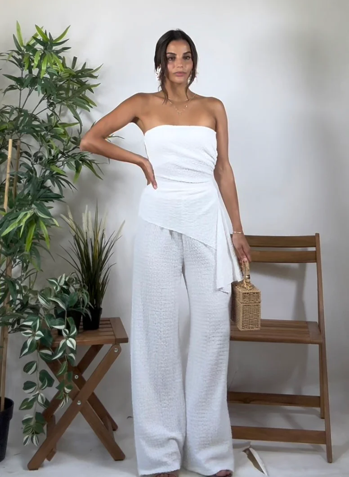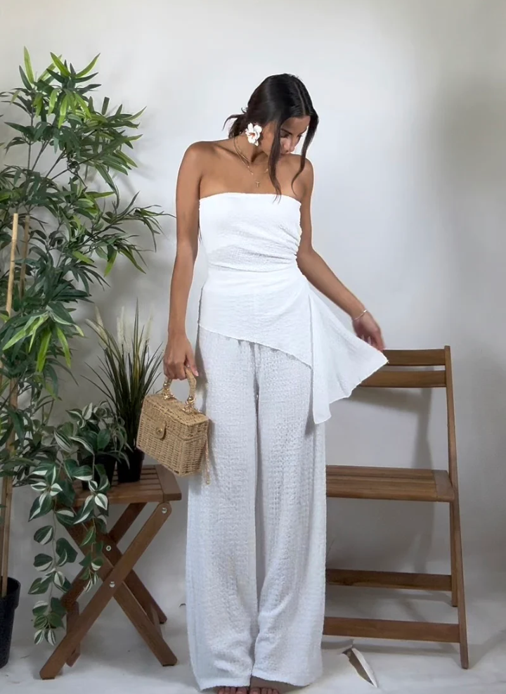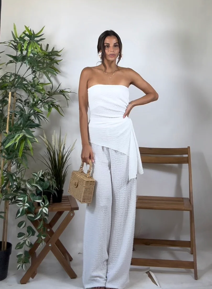 Completo due pezzi in tessuto elastico leggero con texture goffrata, composto da top fascia con drappeggio laterale asimmetrico e pantaloni palazzo a vita alta. Il top avvolge la figura in modo naturale e dona eleganza con l’orlo obliquo. I pantaloni sono ampi, e elasticizzati in vita