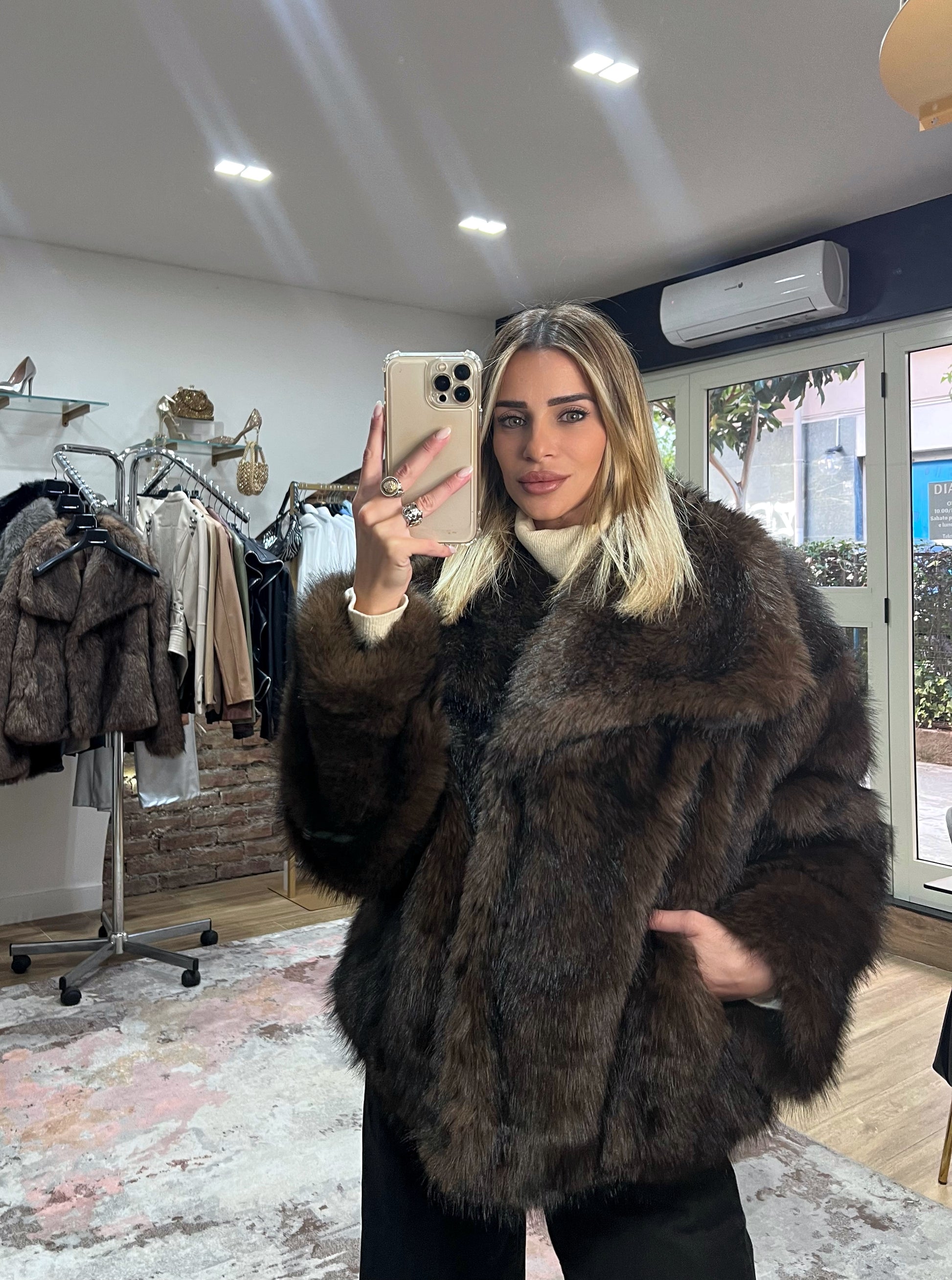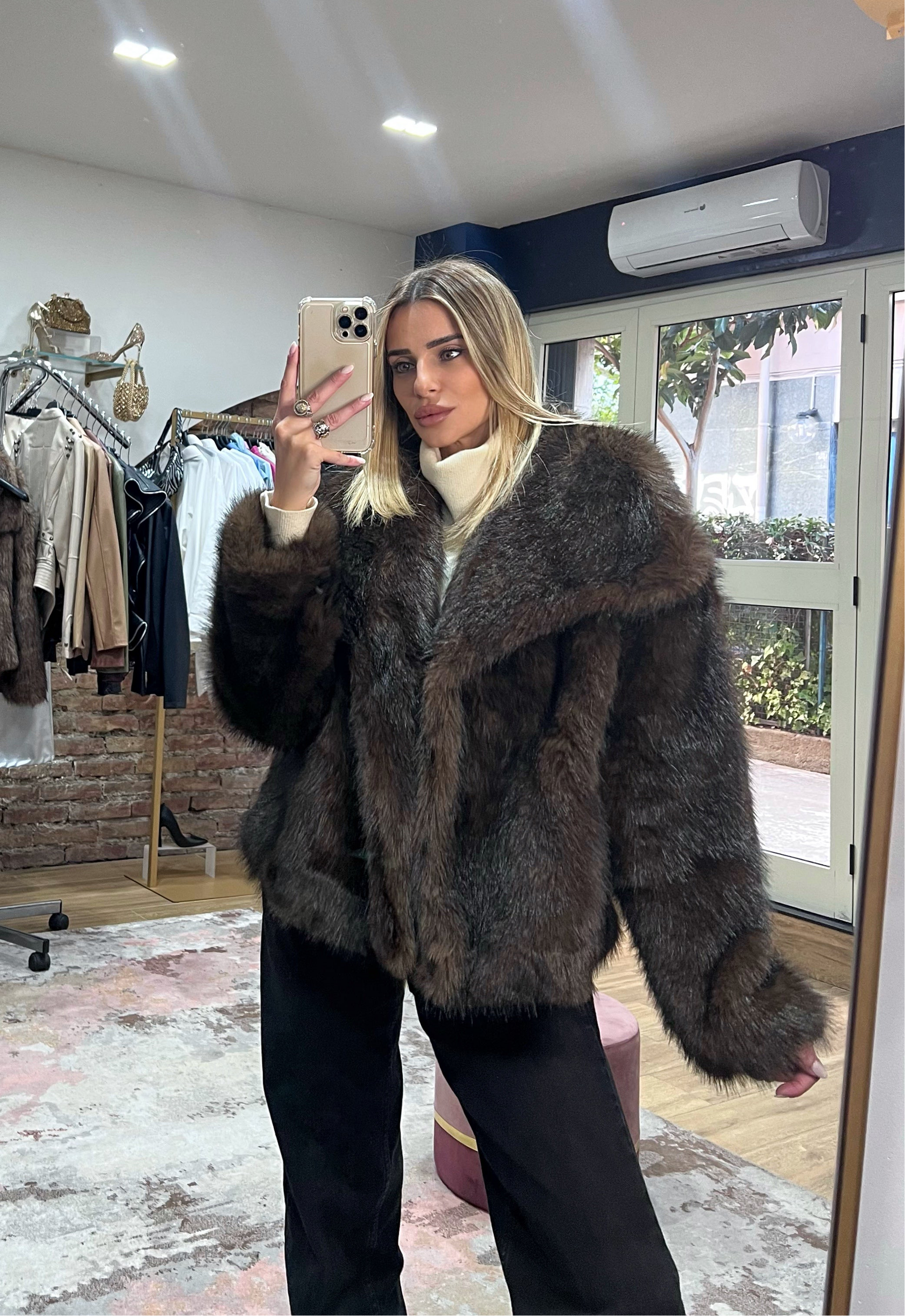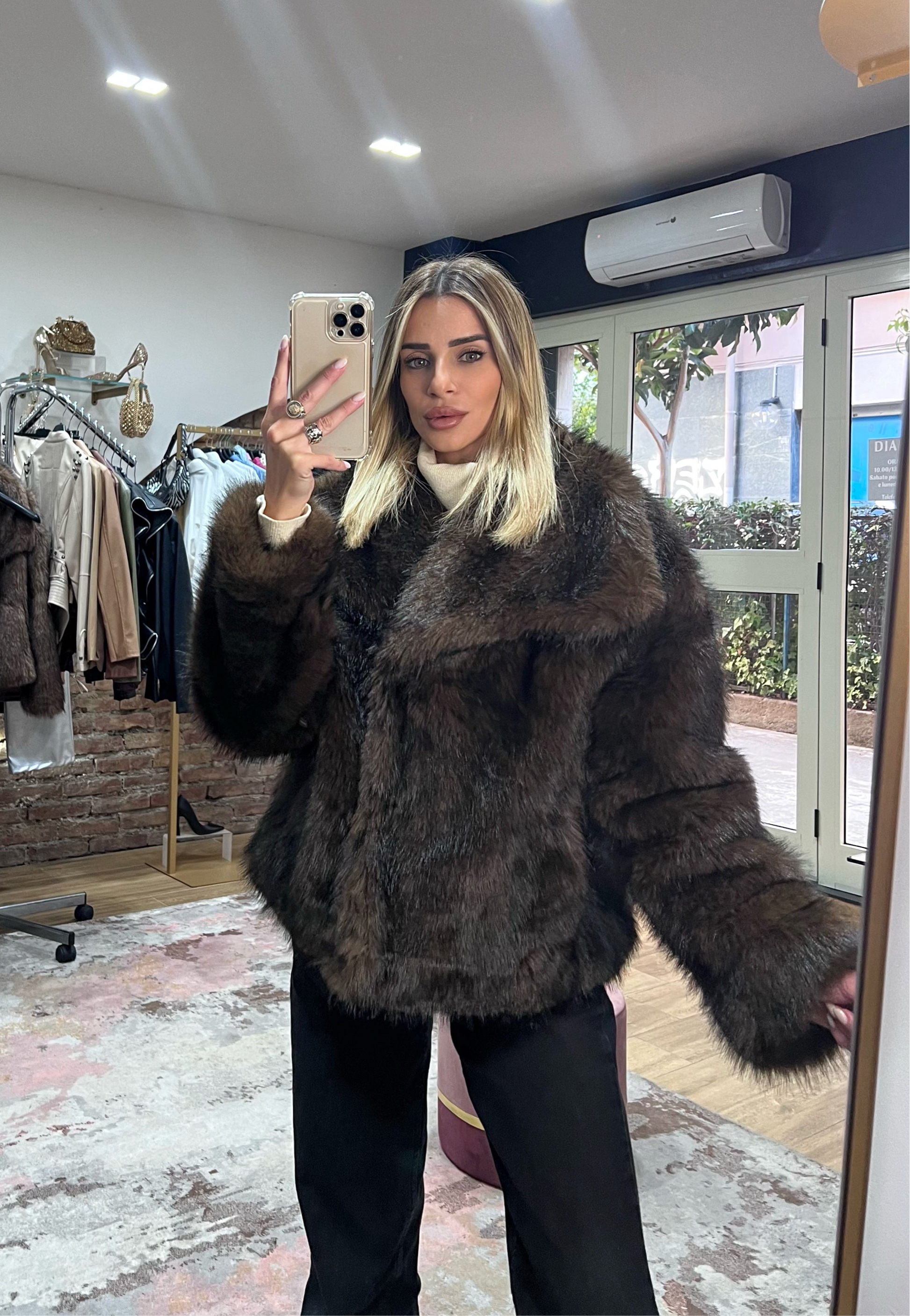Questa giacca in ecopelliccia è un capo d'abbigliamento elegante e confortevole, che unisce lo stile classico della pelliccia di visone al rispetto per gli animali. Il suo colore marrone intenso, con sfumature che richiamano il visone naturale, la rende versatile e facile da abbinare.