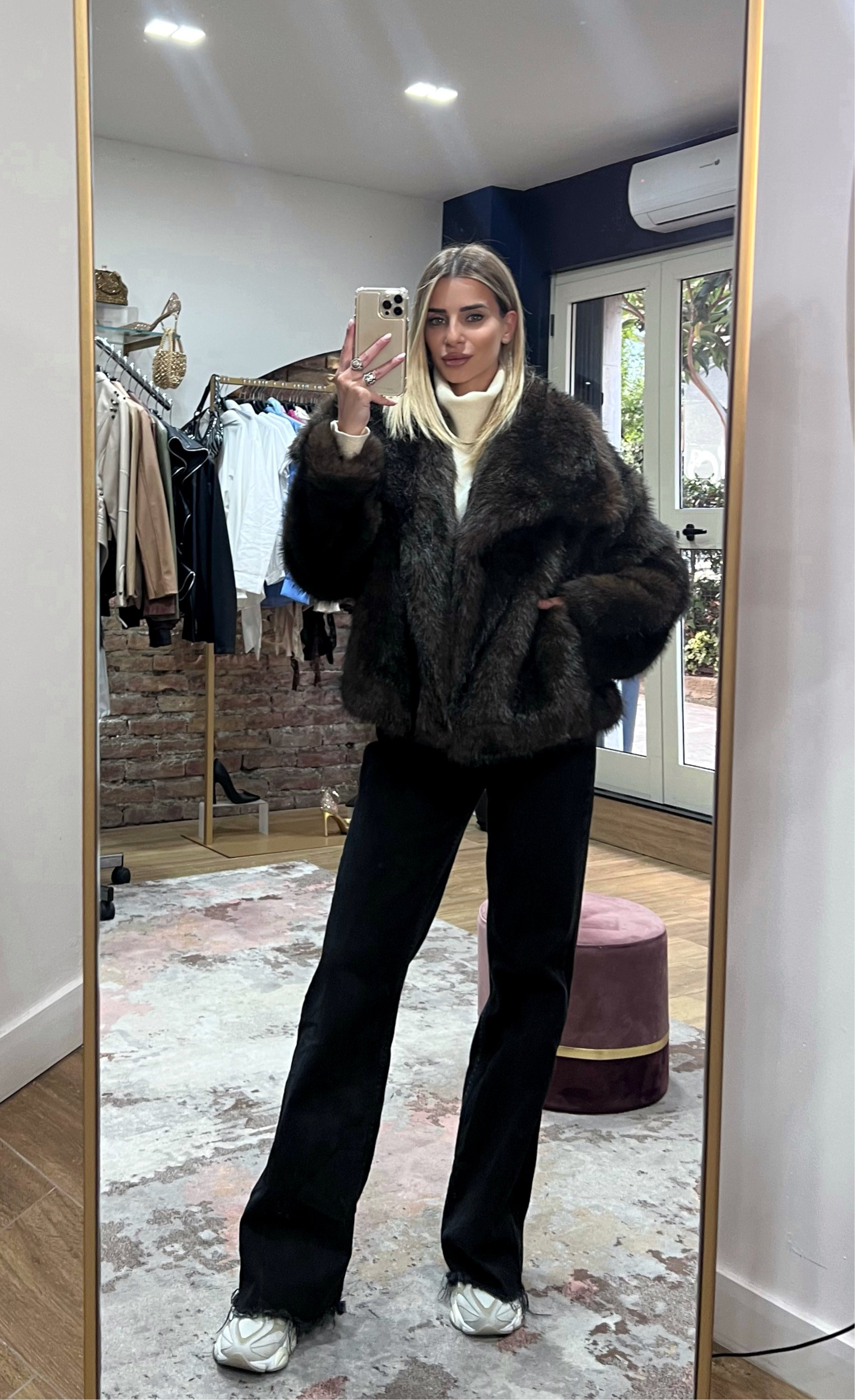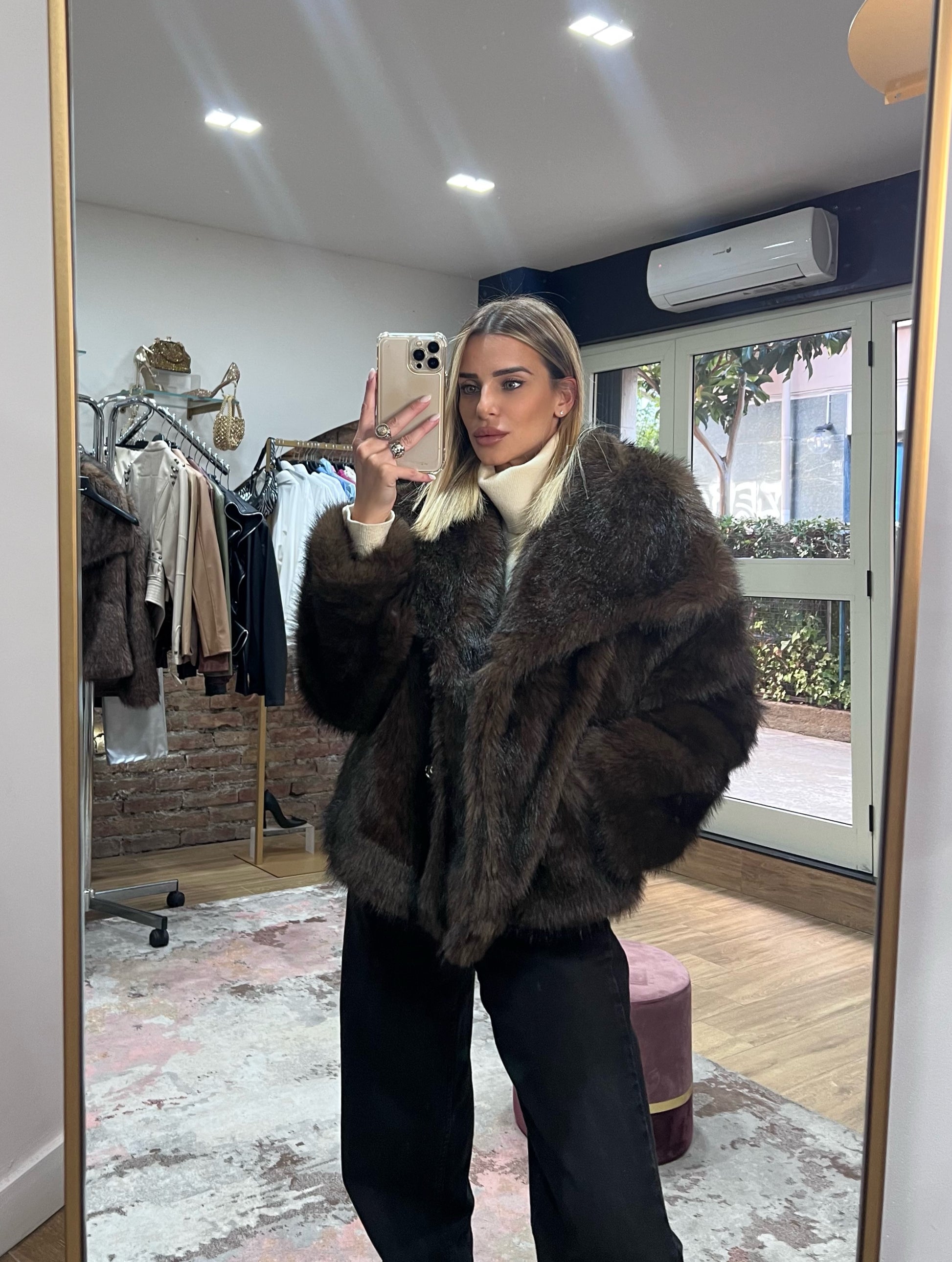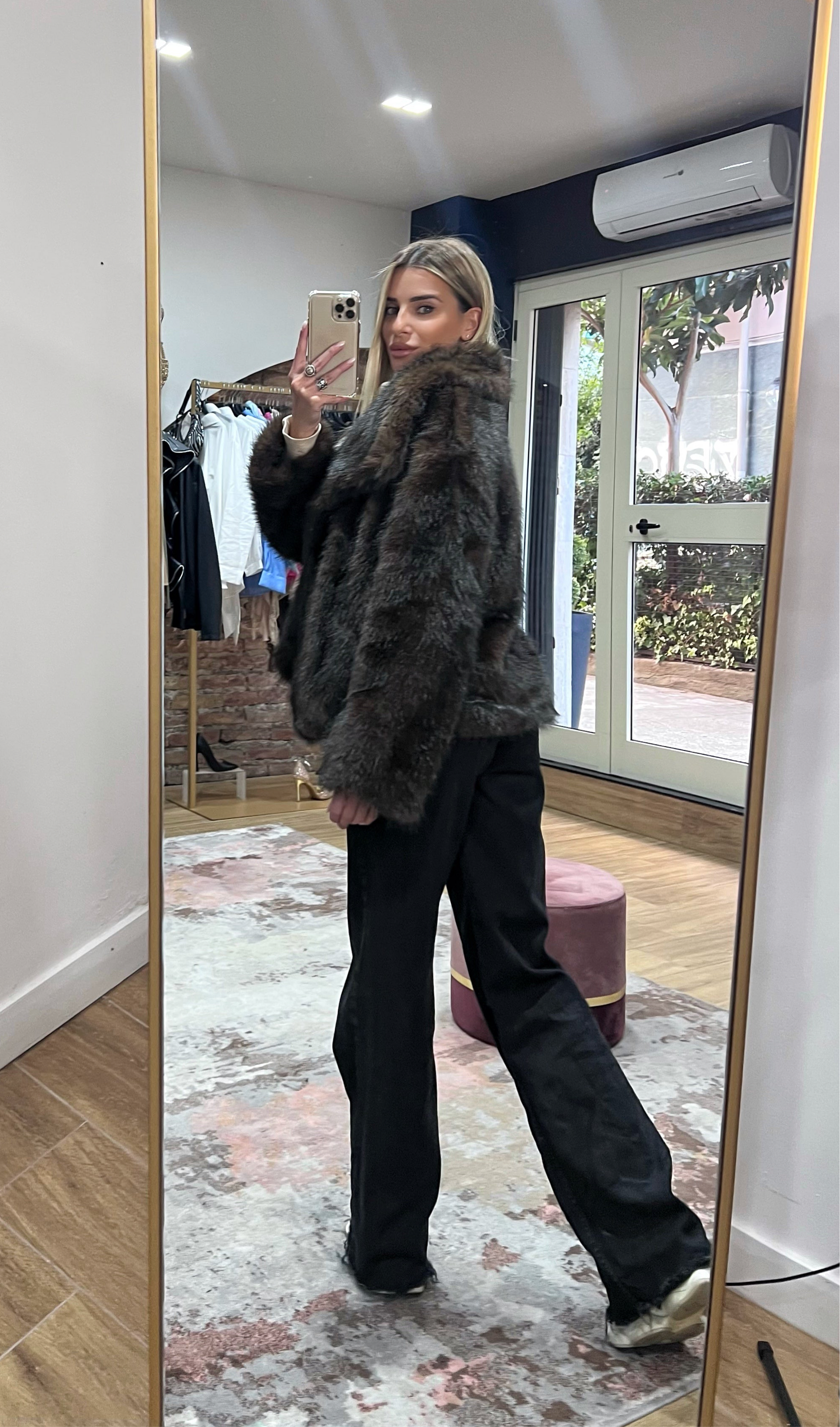 Questa giacca in ecopelliccia è un capo d'abbigliamento elegante e confortevole, che unisce lo stile classico della pelliccia di visone al rispetto per gli animali. Il suo colore marrone intenso, con sfumature che richiamano il visone naturale, la rende versatile e facile da abbinare.