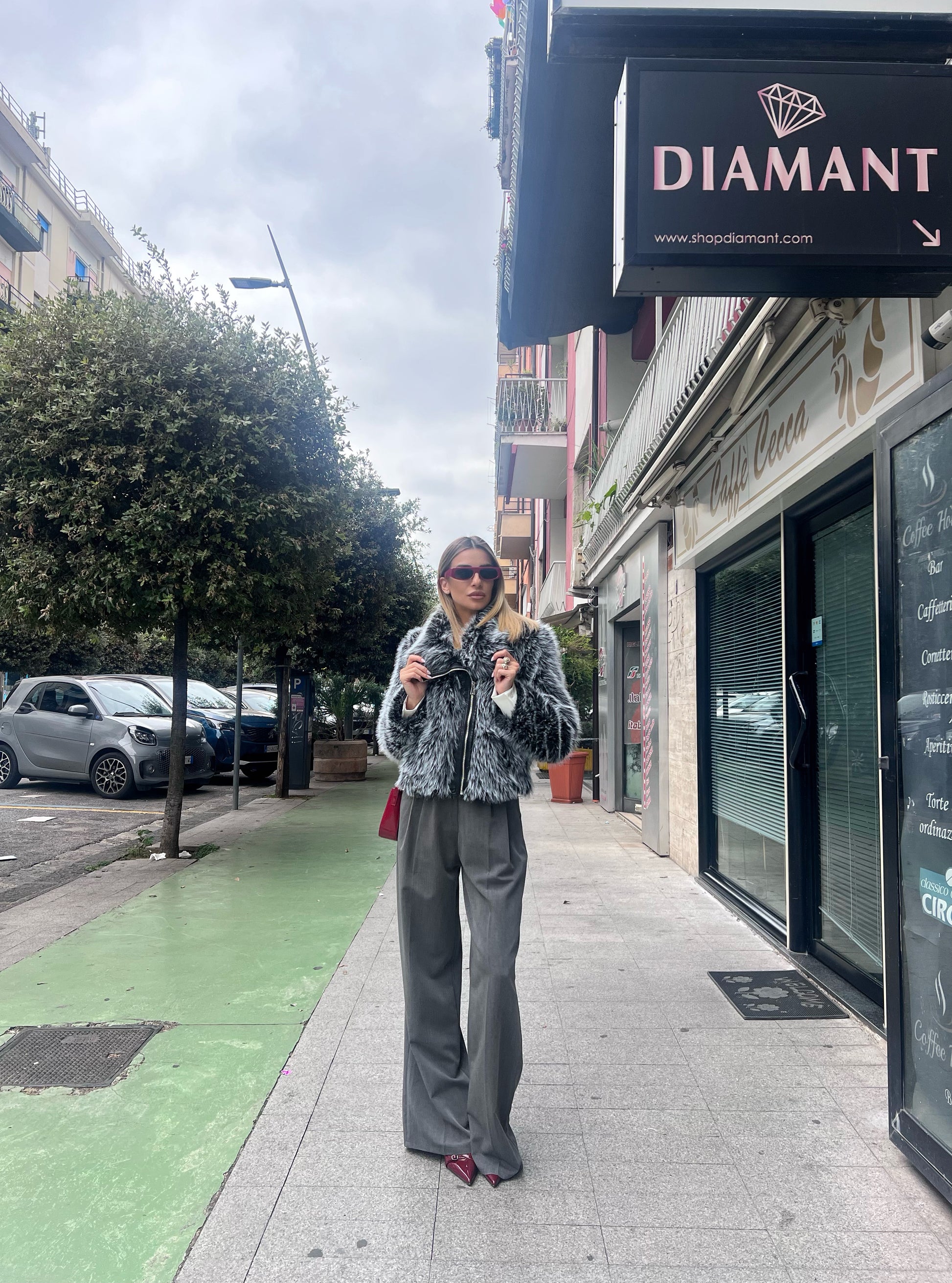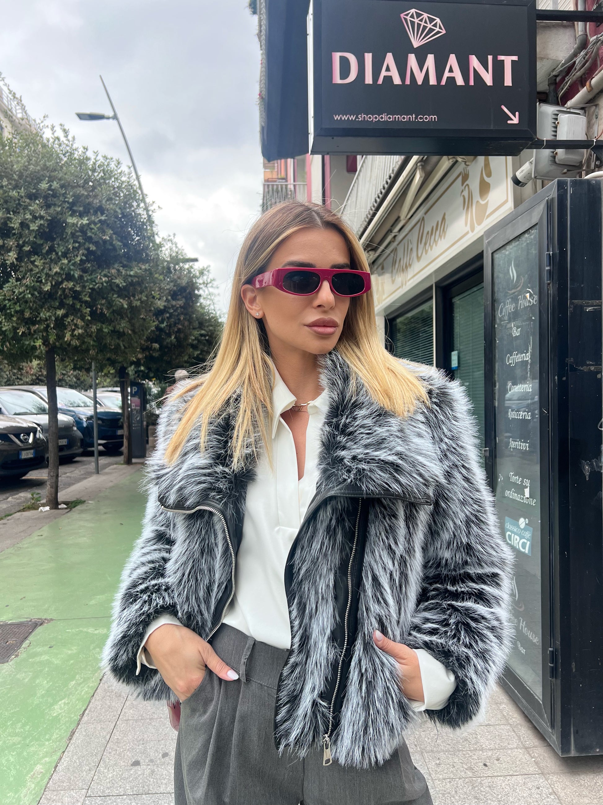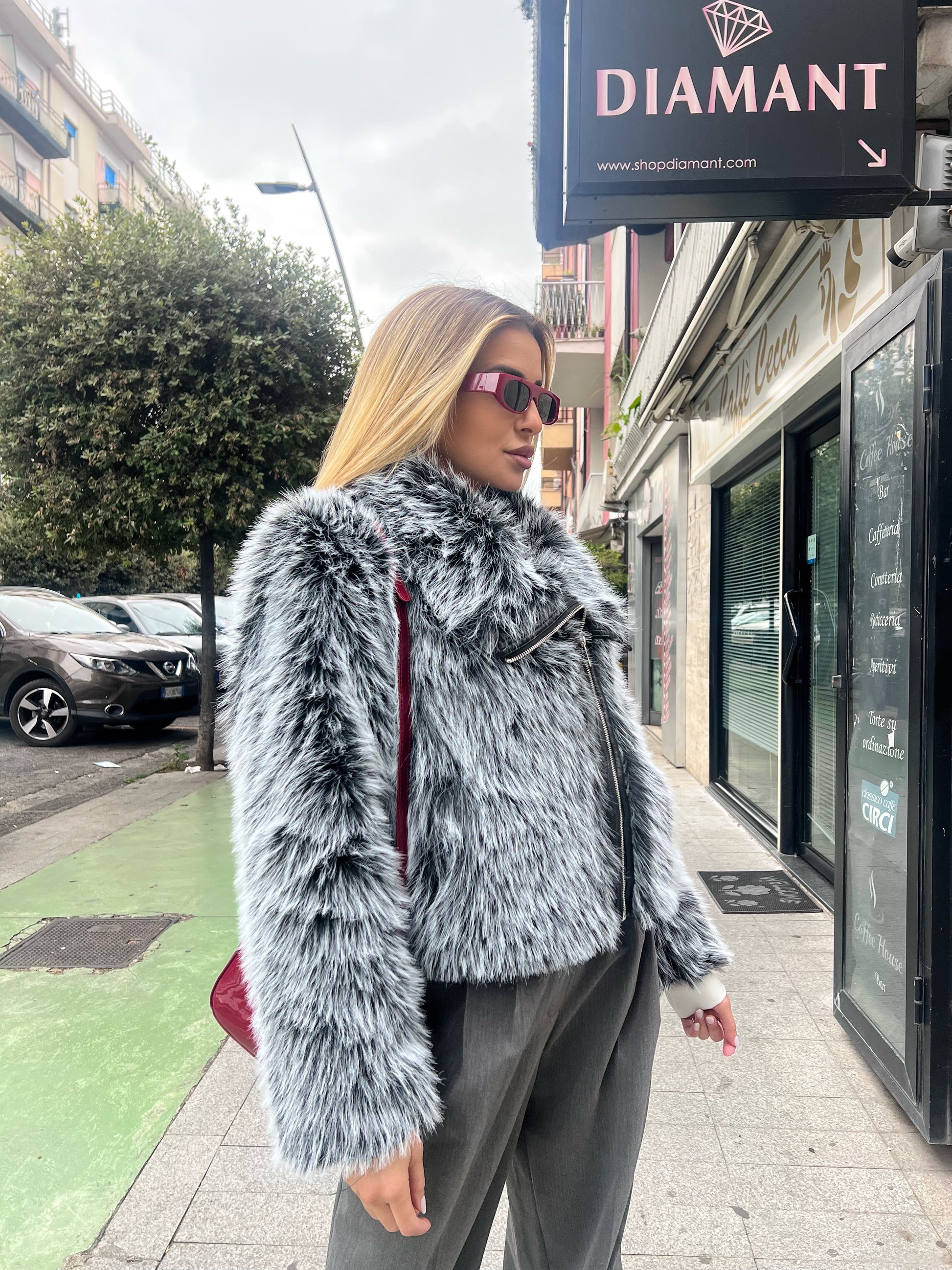 Presenta una cerniera lampo asimmetrica di metallo scuro, posizionata in diagonale sul davanti.