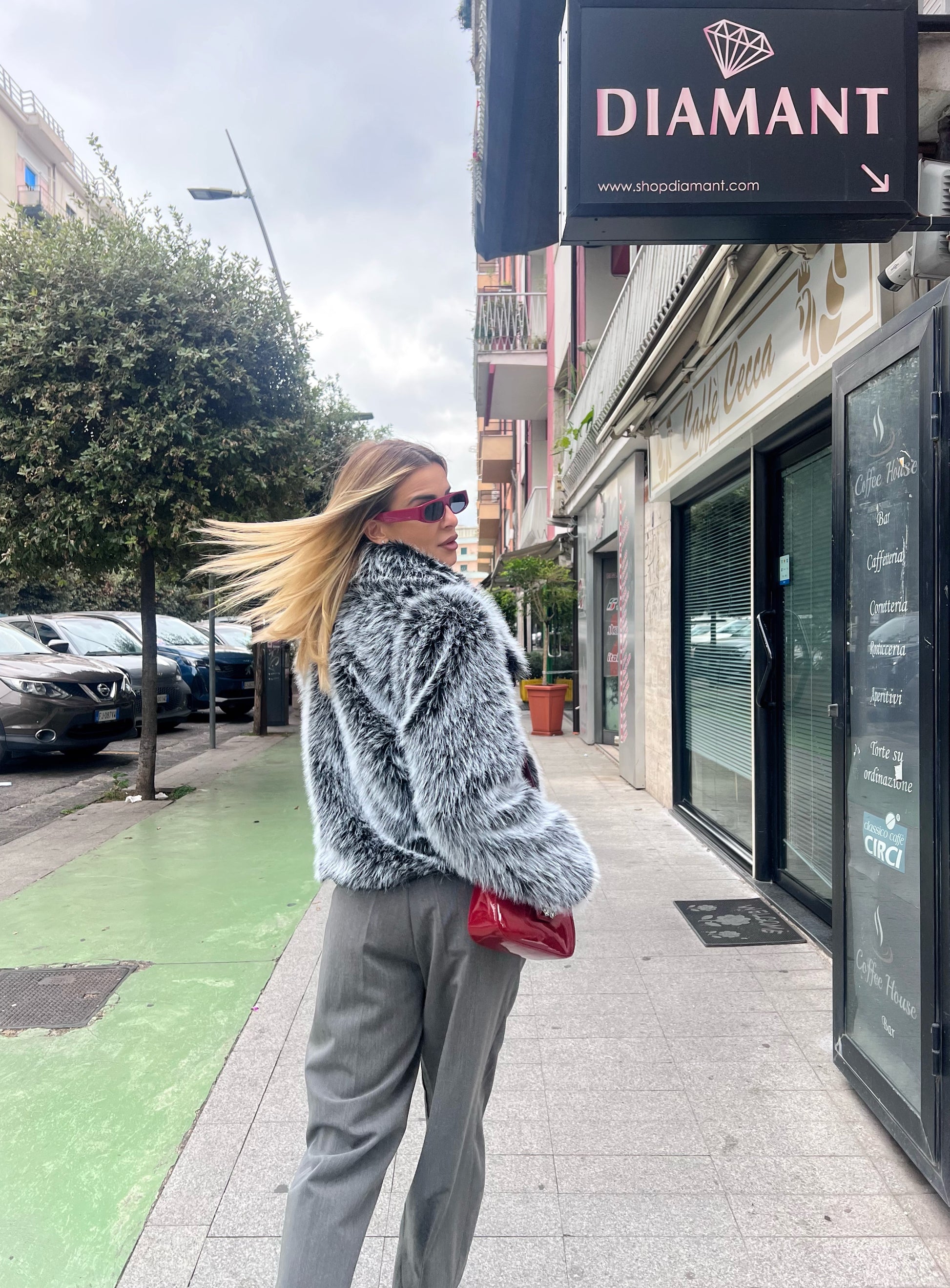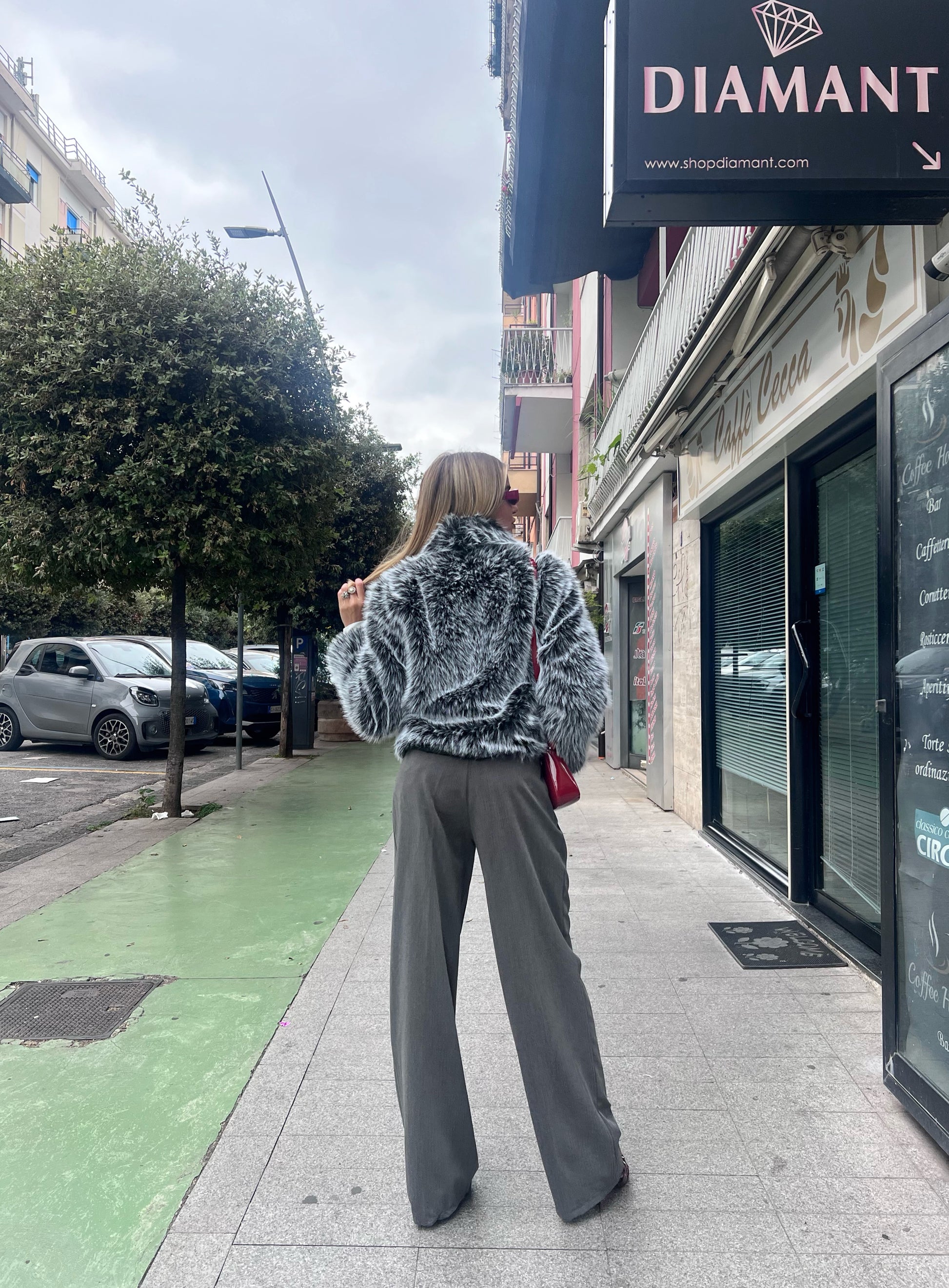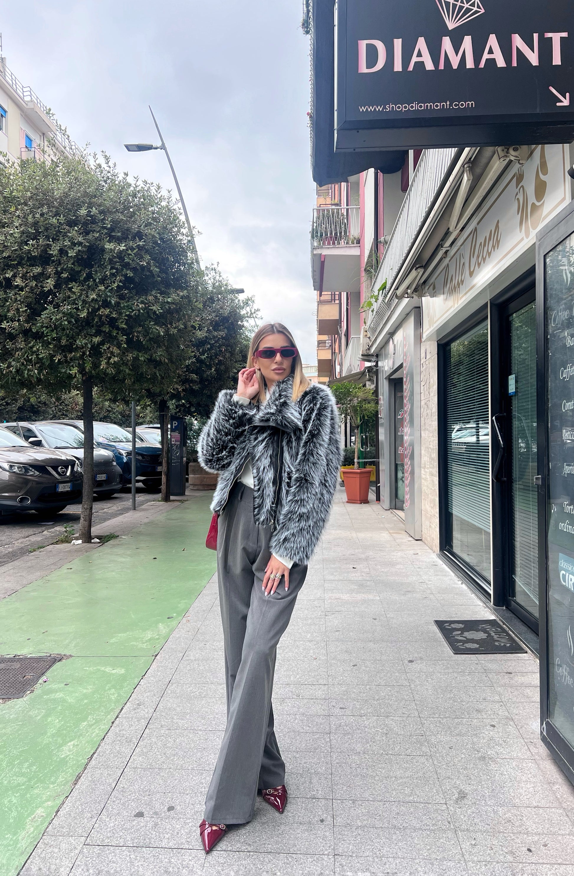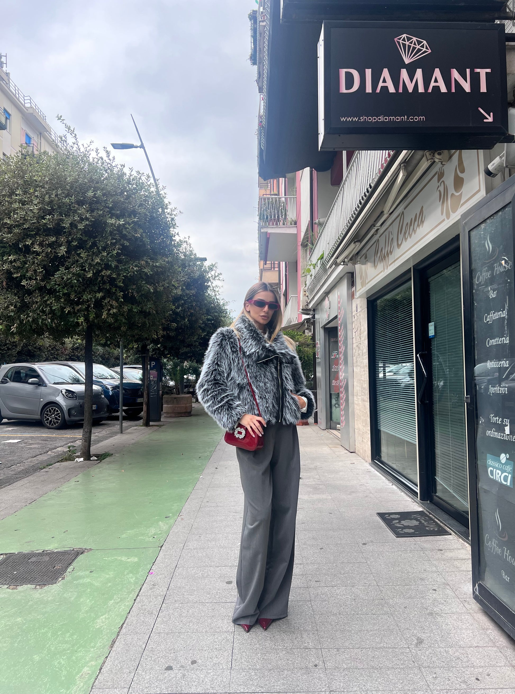 Presenta una cerniera lampo asimmetrica di metallo scuro, posizionata in diagonale sul davanti.