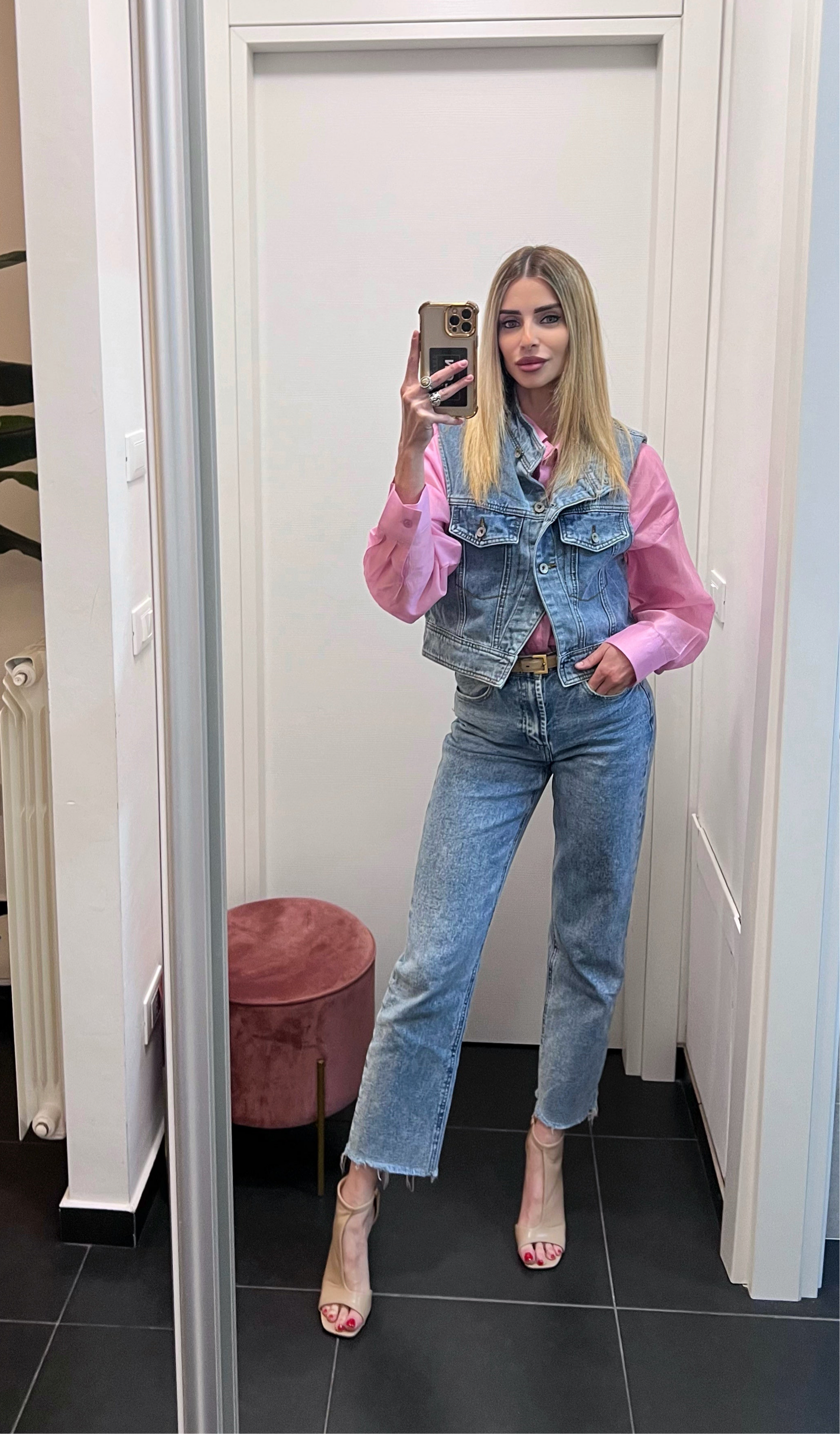 Gilet in jeans perfetto per un tocco glam al tuo look casual. Modello cropped dal taglio asimmetrico. Colletto alto con chiusura a bottoni.