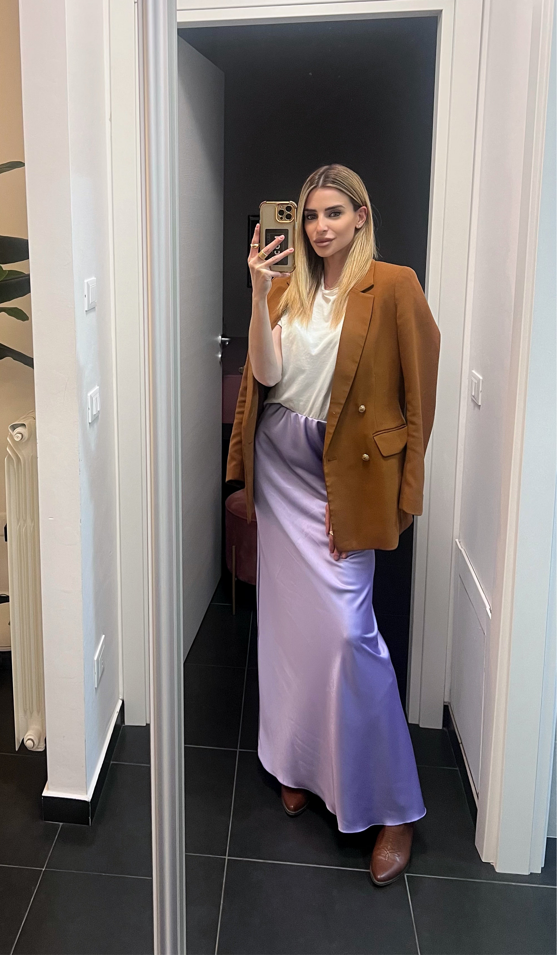 Gonna color lilla in raso, modello lungo svasato sul fondo, vita media con elastico