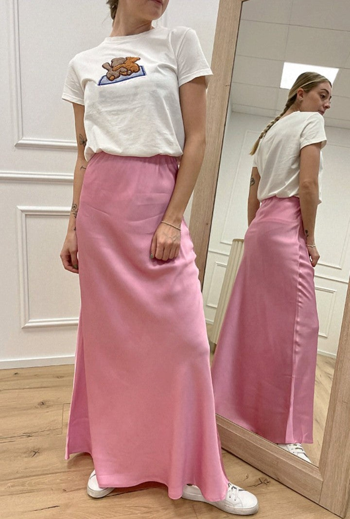 Gonna color rosa in raso, modello lungo svasato sul fondo, vita media con elastico.