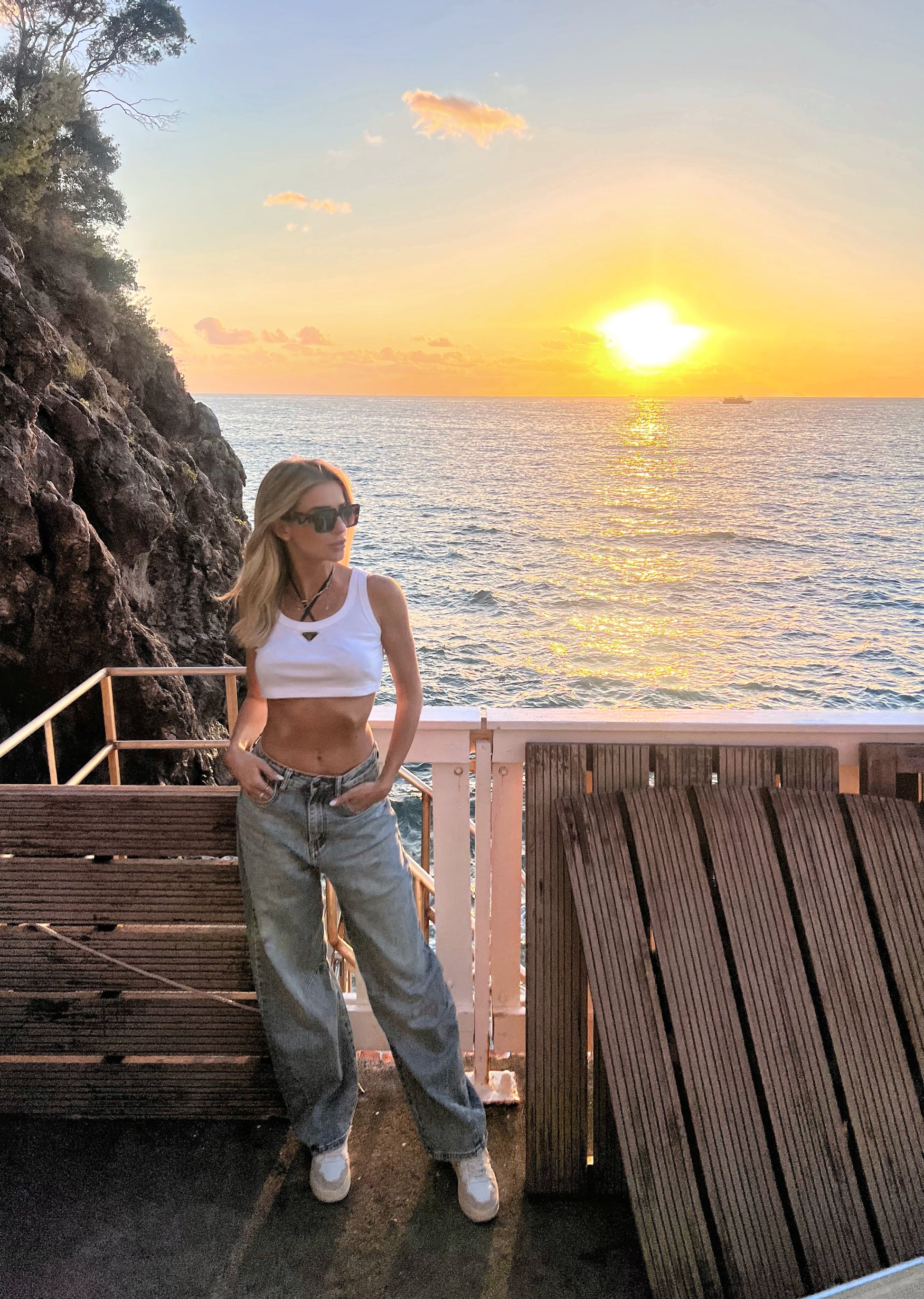 Jeans Barrel , denim chiaro con un leggero effetto vintage, modello stondato nella gamba esterna, lungo fin sopra il piede.