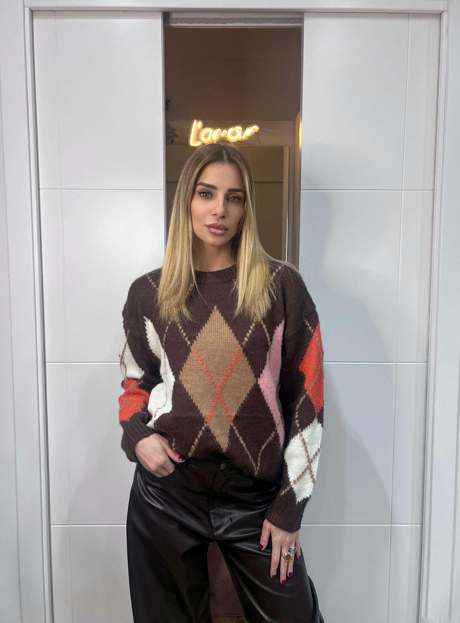- Stile e Design: Maglione in maglia pesante con motivo Argyle (rombi) che evoca un look preppy e retrò.