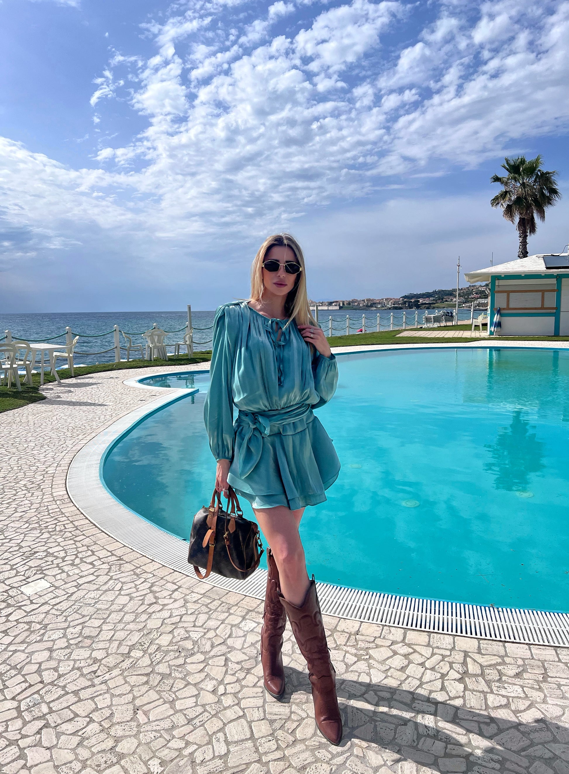 Mini abito colore champagne con maniche lunghe, spalline imbottite, cut-out frontale con laccetto, fiocco e gonna doppia. Elastico in vita per un fit perfetto.