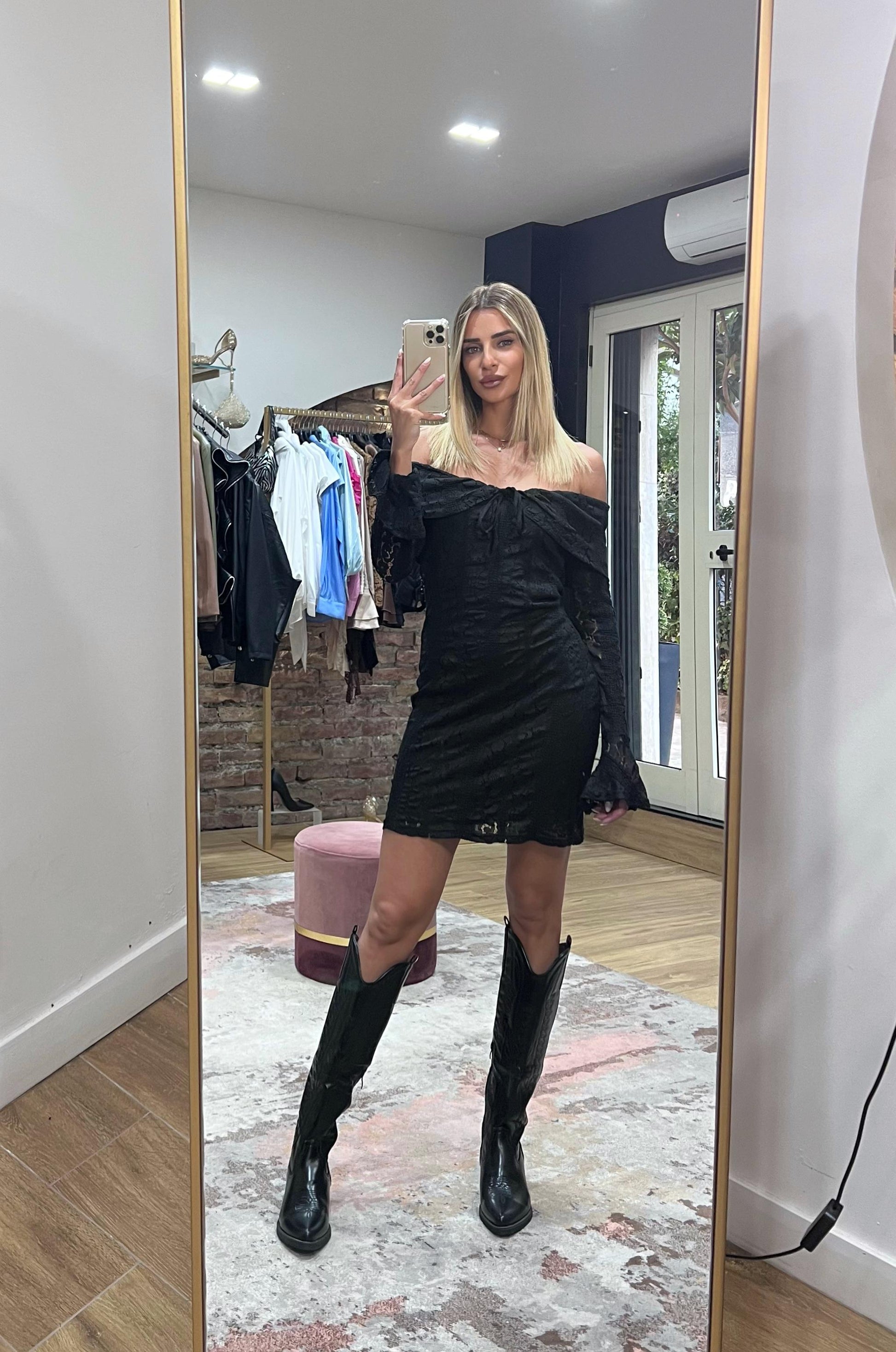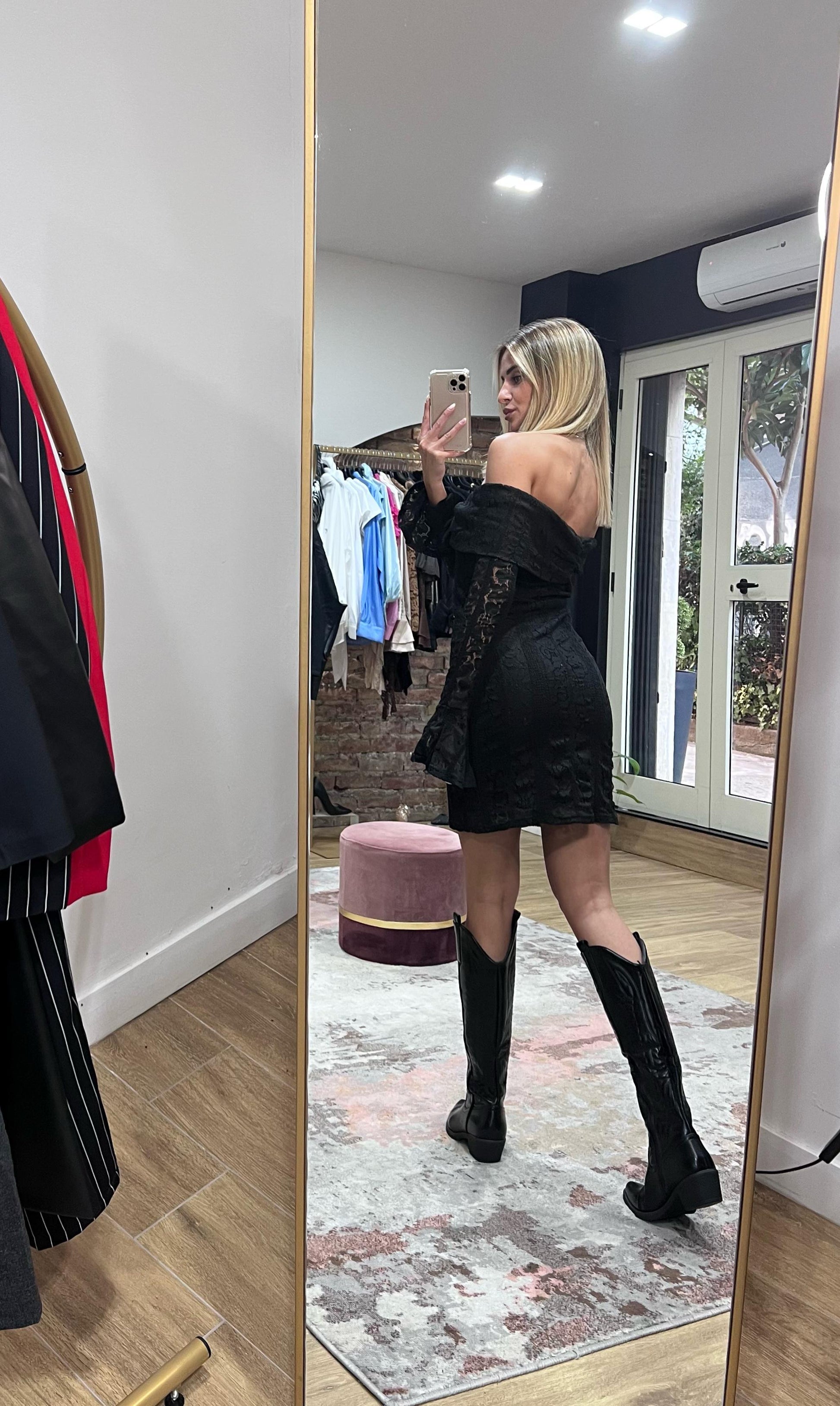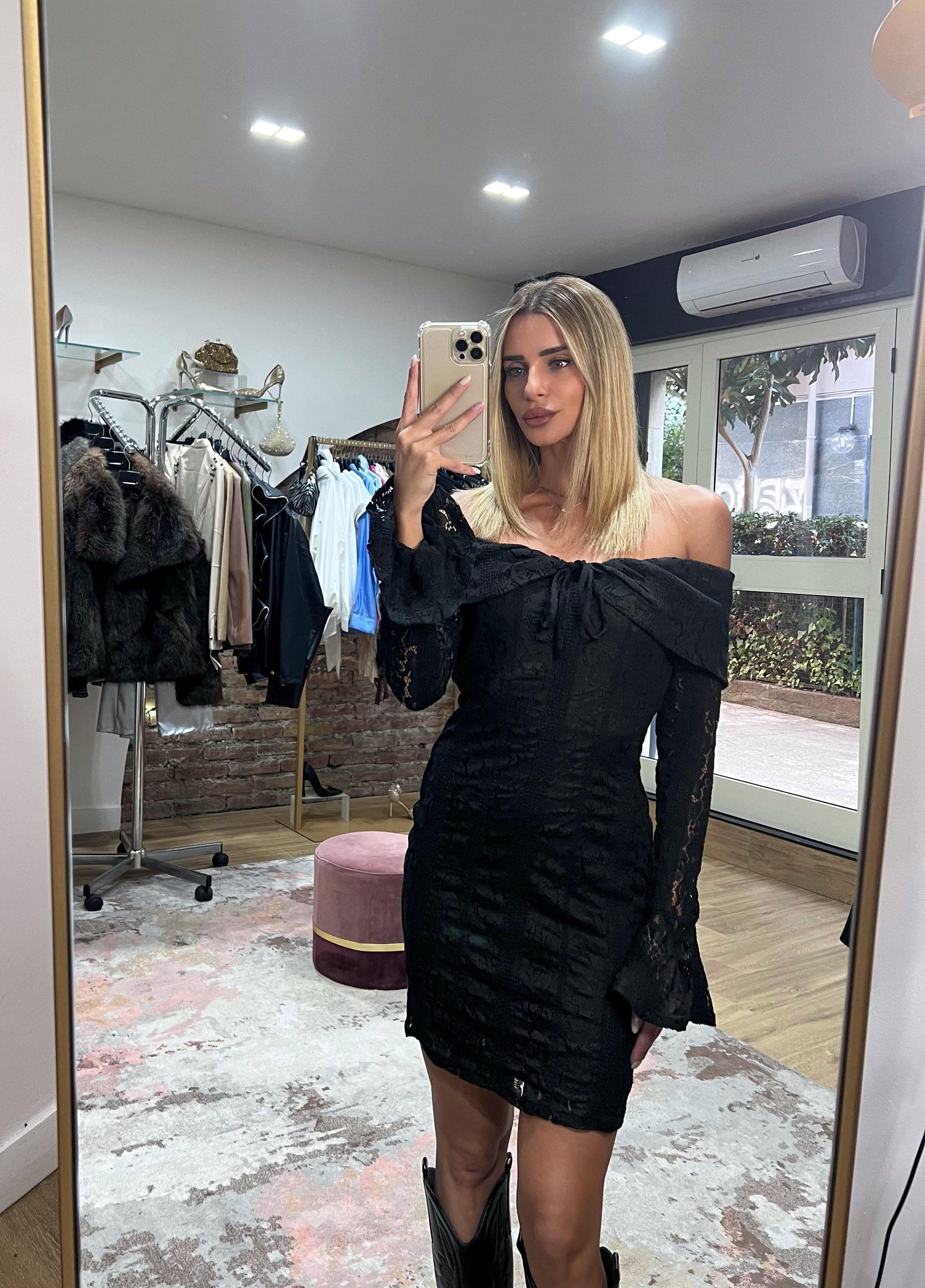 Mini abito nero realizzato in pizzo elasticizzato, che gli conferisce una vestibilità aderente. Lo stile dello scollo è alla Bardot, che lascia le spalle scoperte, ed è impreziosito da un volant che ne sottolinea la linea. Le maniche sono lunghe e a campana, aggiungendo un tocco romantico e svolazzante. L'abito si chiude con una cerniera posta sulla parte posteriore.