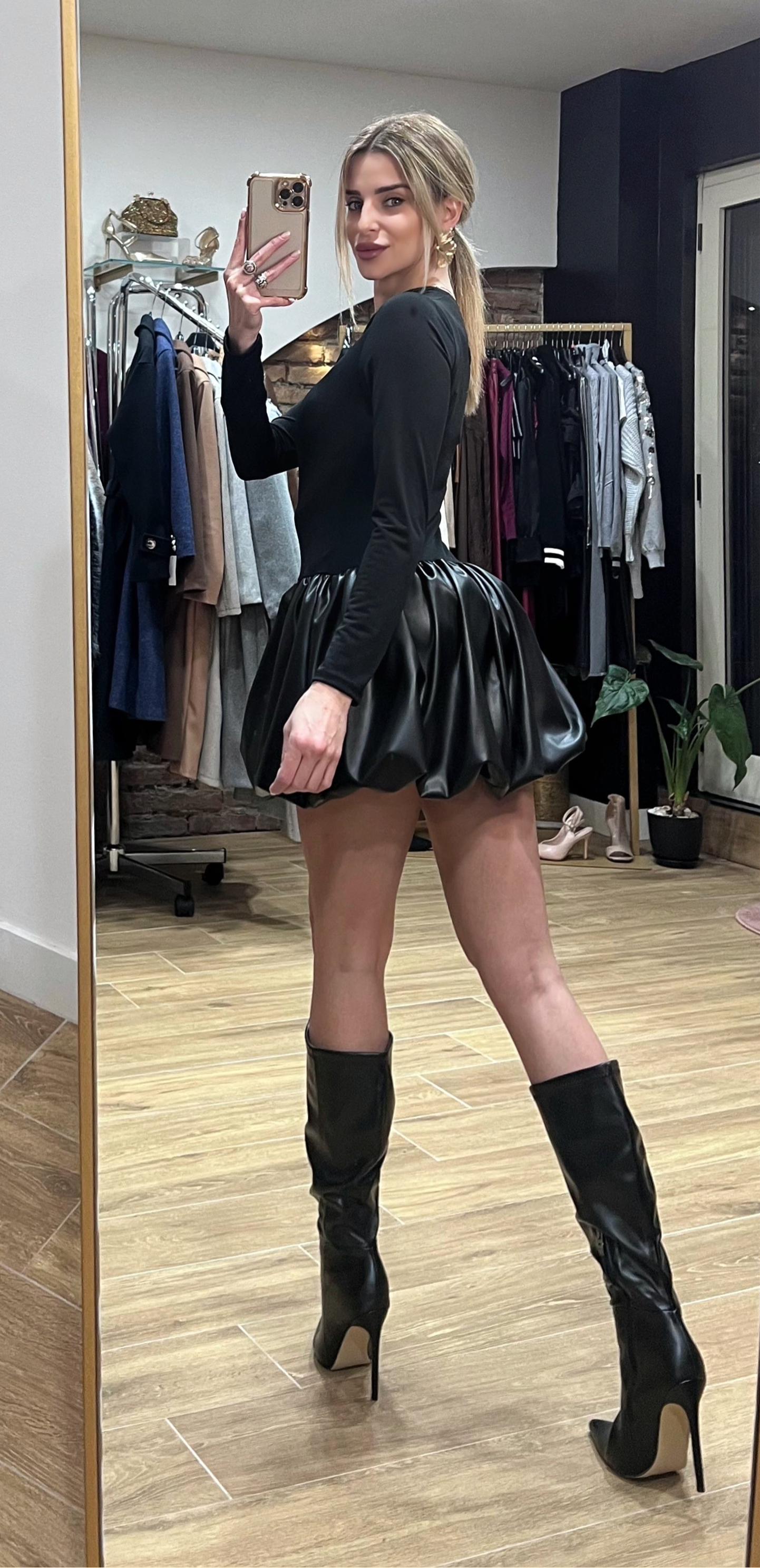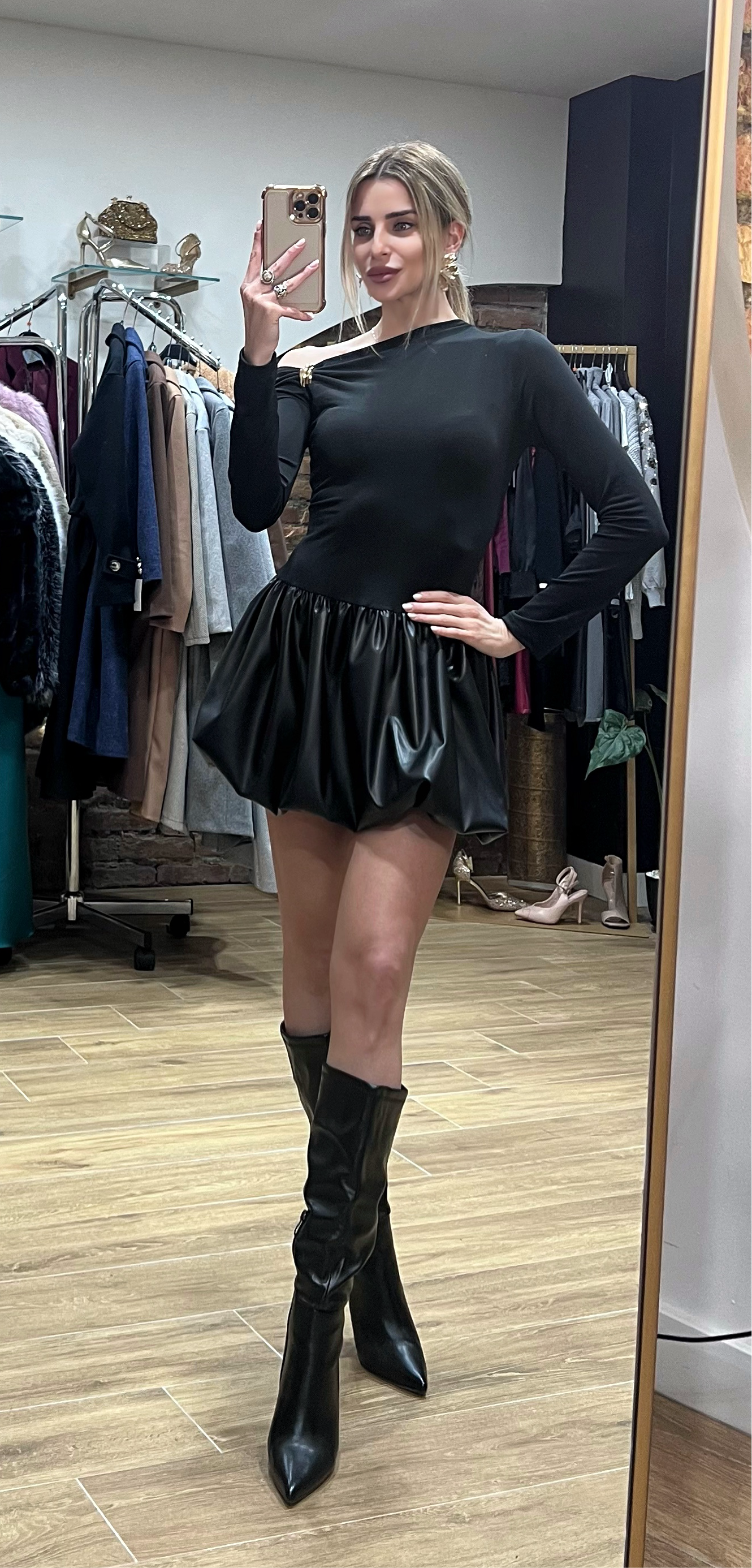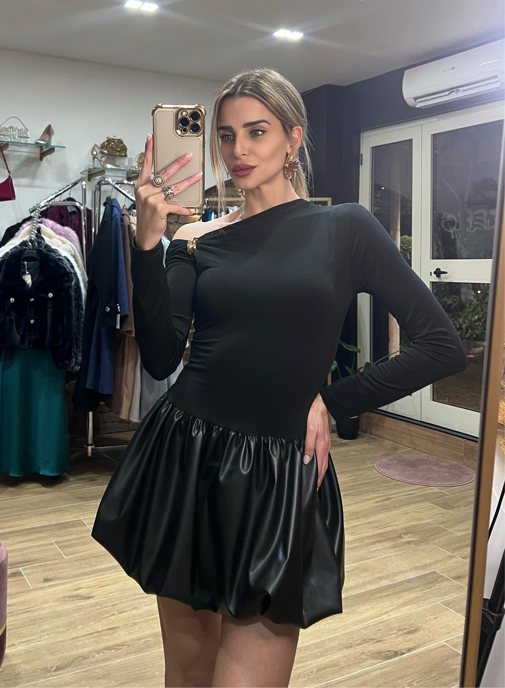 Abito con scollo asimmetrico, gonna a palloncino in ecopelle. Taglia unica, veste fino a una 44