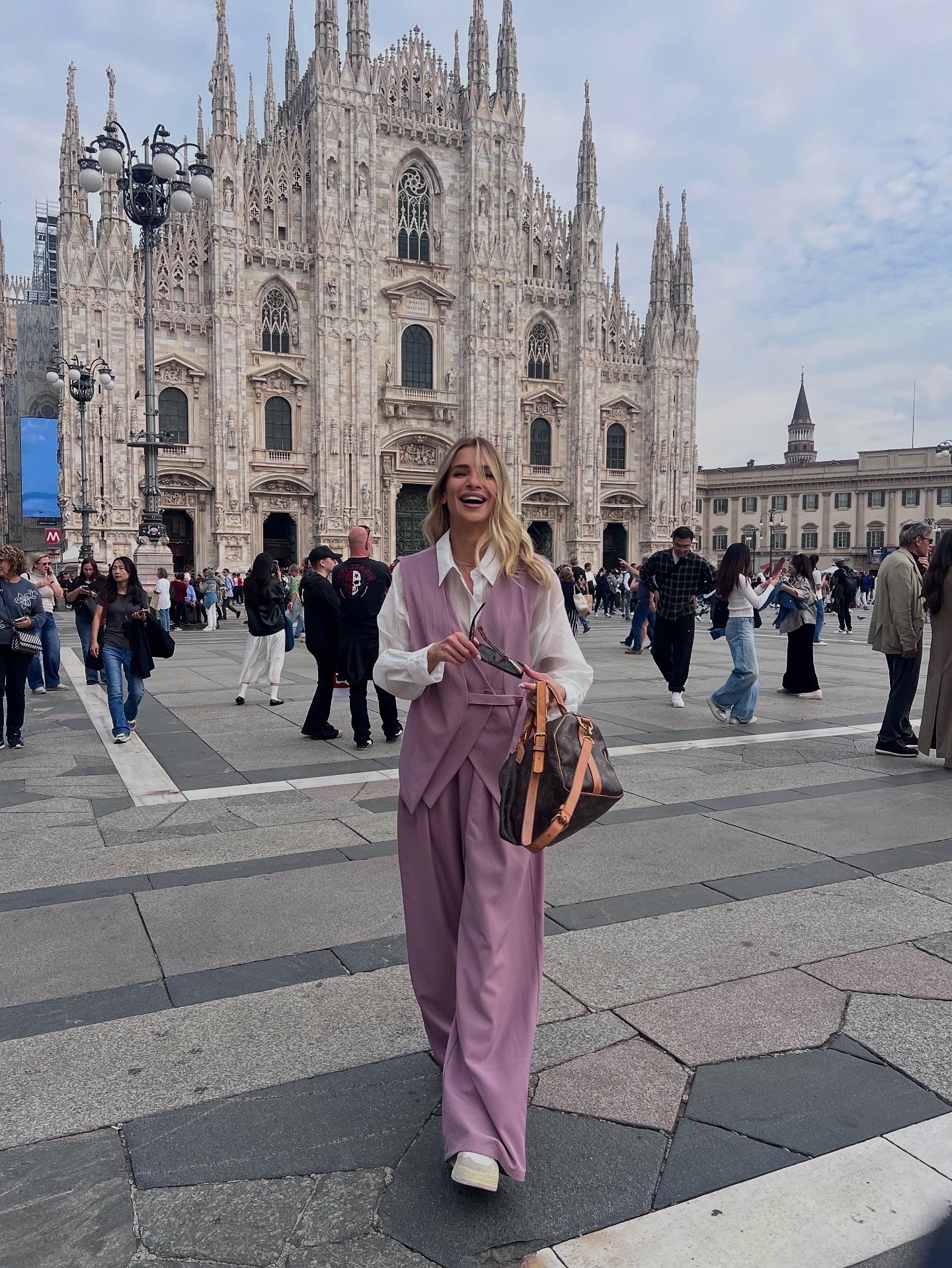 Il tailleur è un completo elegante e moderno, composto da un gilet e dei pantaloni a palazzo. Il colore è un raffinato malva , che si adatta a diverse occasioni.